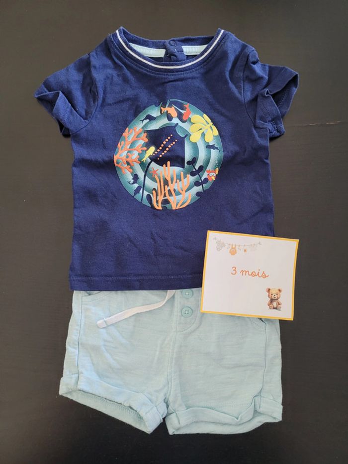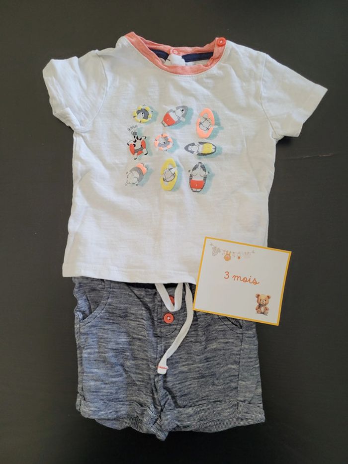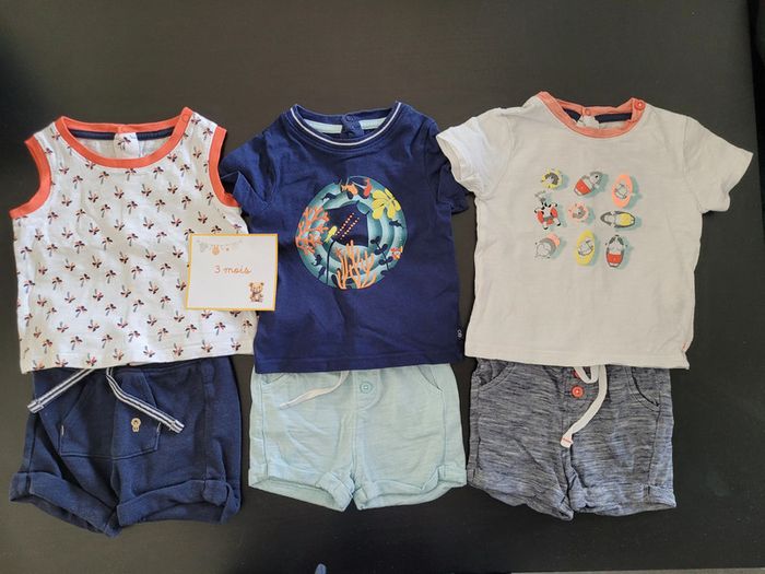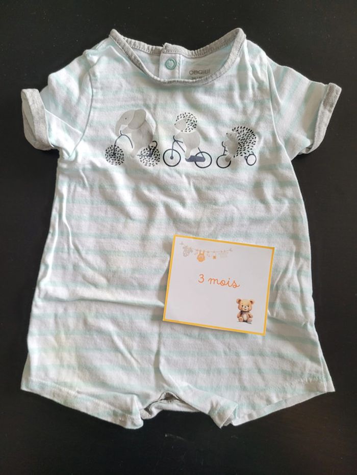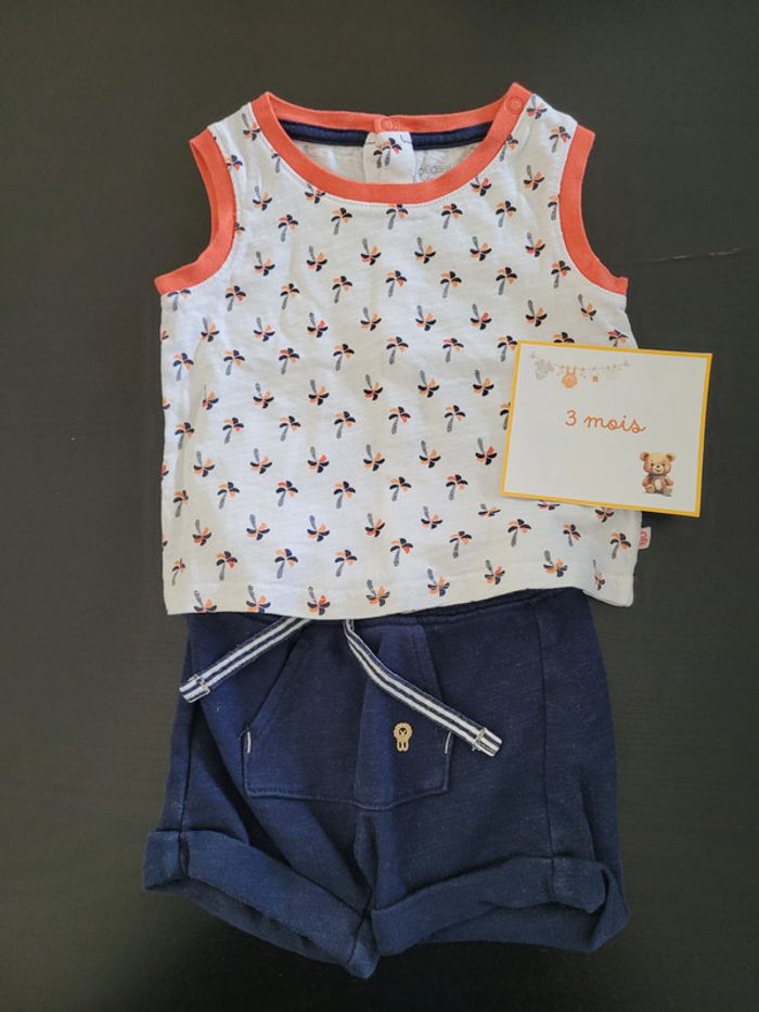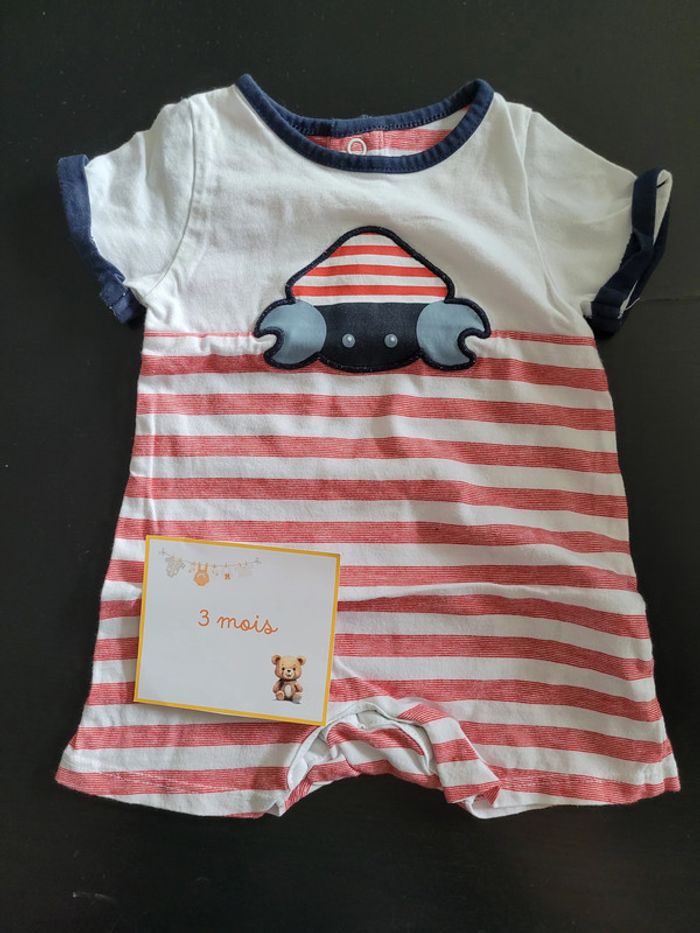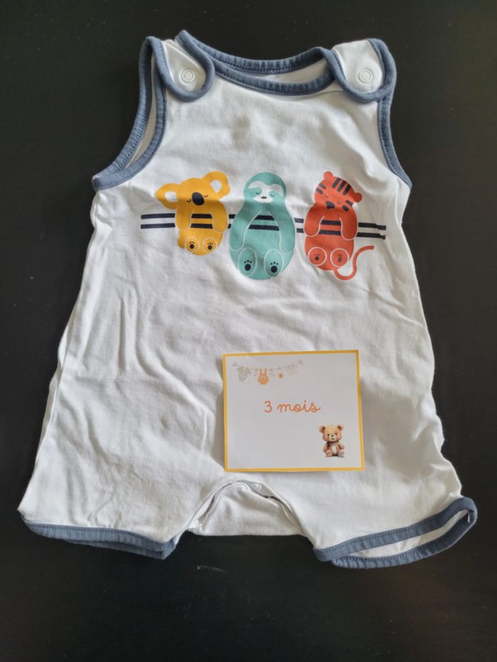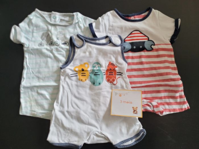 Lot habits été garçon 3 mois Les hauts et les bas sont interchangeables pour faire des assortiments différents sur les ensembles shorts et débardeurs. La barboteuse blanche rayée de bleu clair a des auréoles jaunes sur le devant qui ne partent pas au lavage.