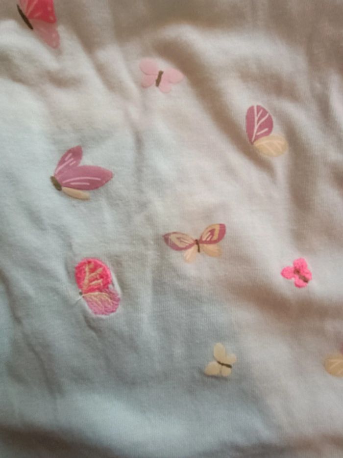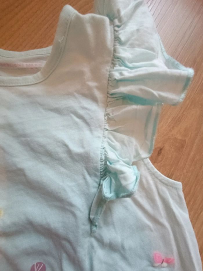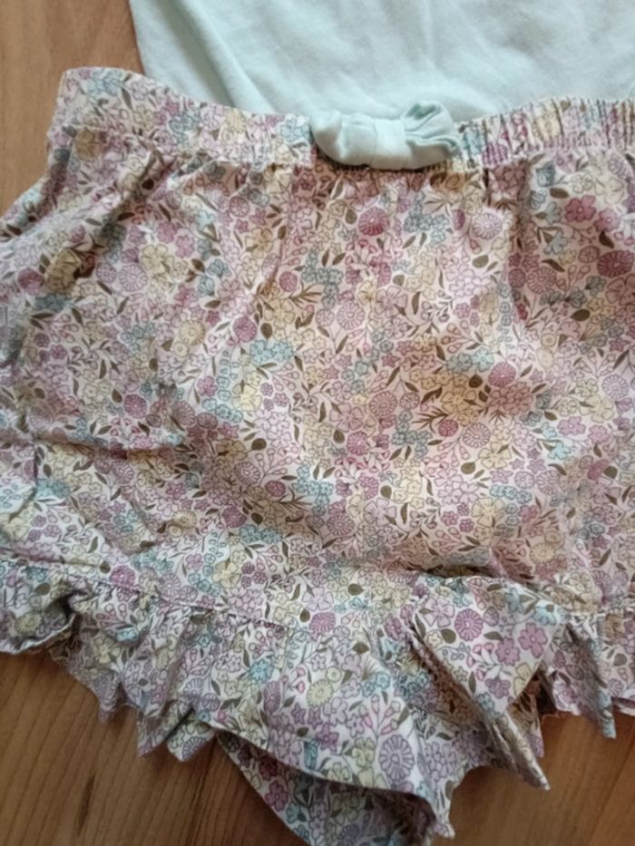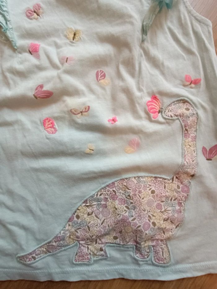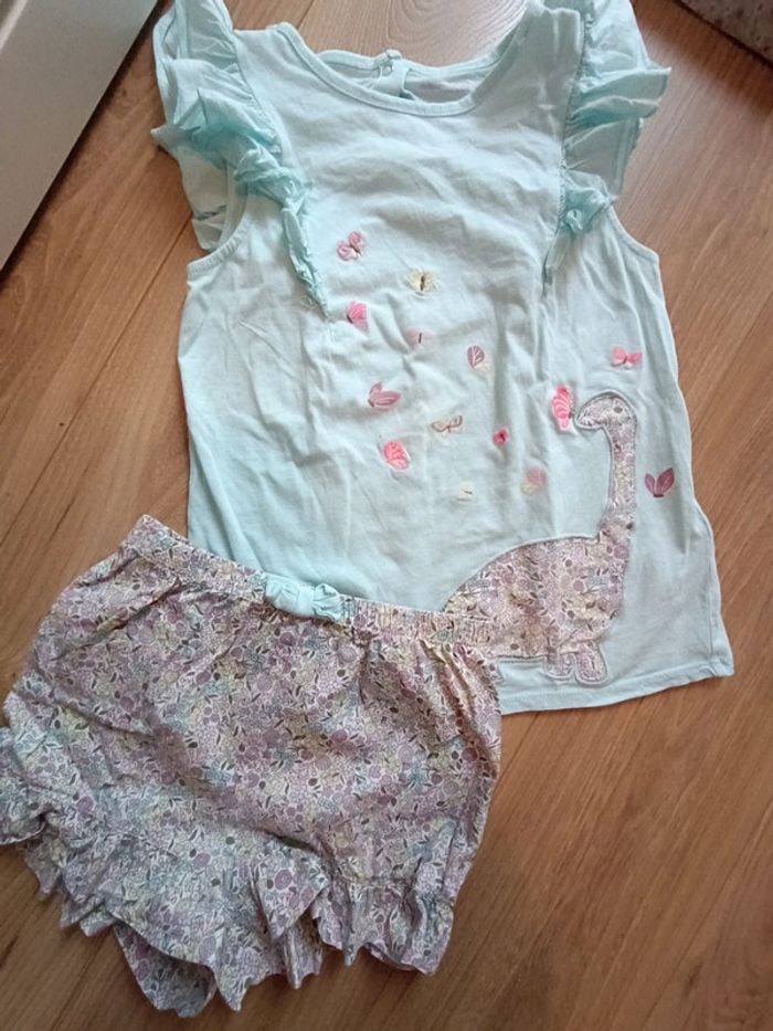 Pyjama composé d'un short à volants en tissu liberty, un débardeur bleu à motif dinosaure et petits papillons Tache sur le devant #mariol69110fille8ans
