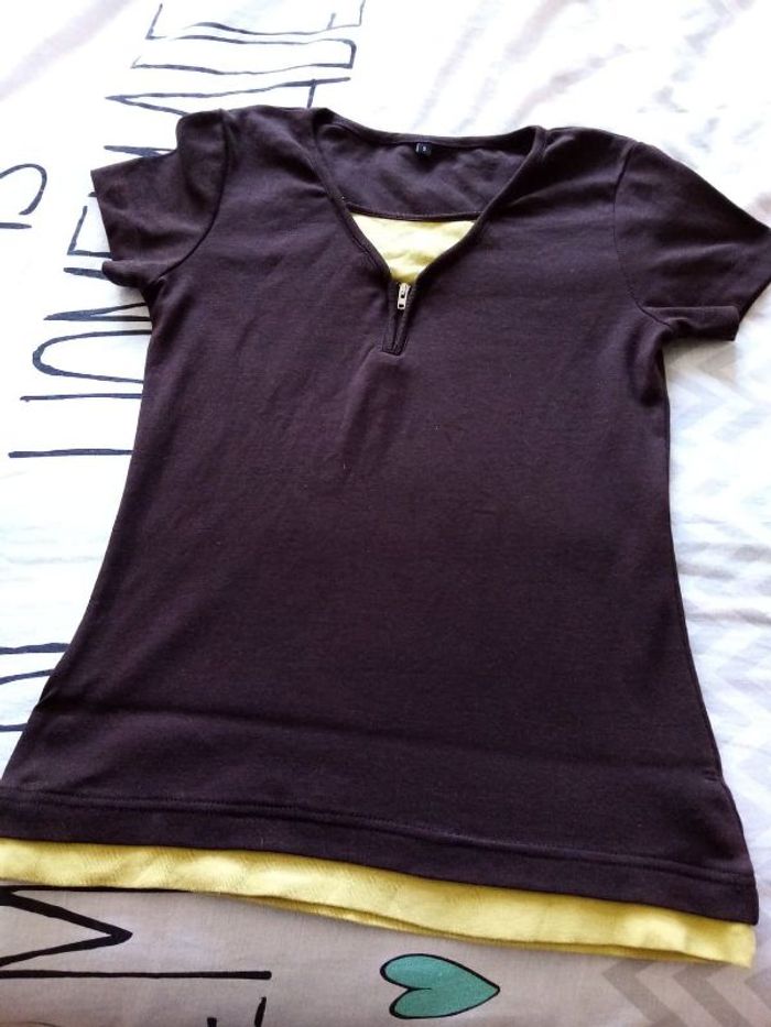 t-shirt col en V jaune ainsi que le bas du t-shirt