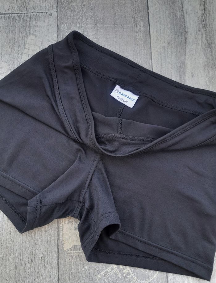 Short / Shorty noir, Energétics Dry Plus • Lien de serrage à la taille • Matière respirante • Taille 36 qui peut convenir à un 34 ➥ Très bon état • Tour de taille 70 cm • Longueur 27 cm • Hauteur taille 20,5 cm