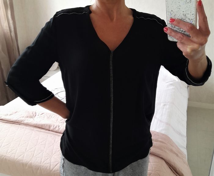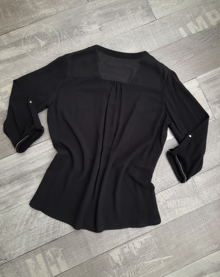 Chemisier noir perlé argenté, neuf - Cache Cache • Décolleté en V • Voile semi-transparent en haut du dos • Manches 3/4 avec revers • Finition arrondie • Matière douce, agréable à porter • Taille 38 ➥ Neuf sans étiquette • Largeur aisselle 49 cm • Longueur 63 cm