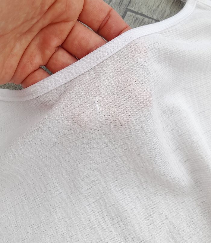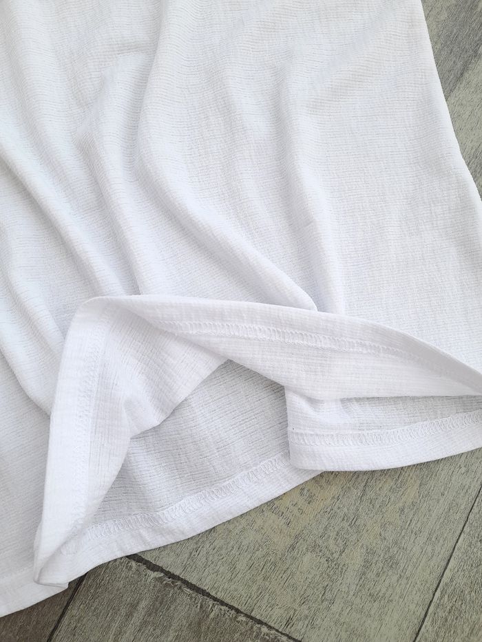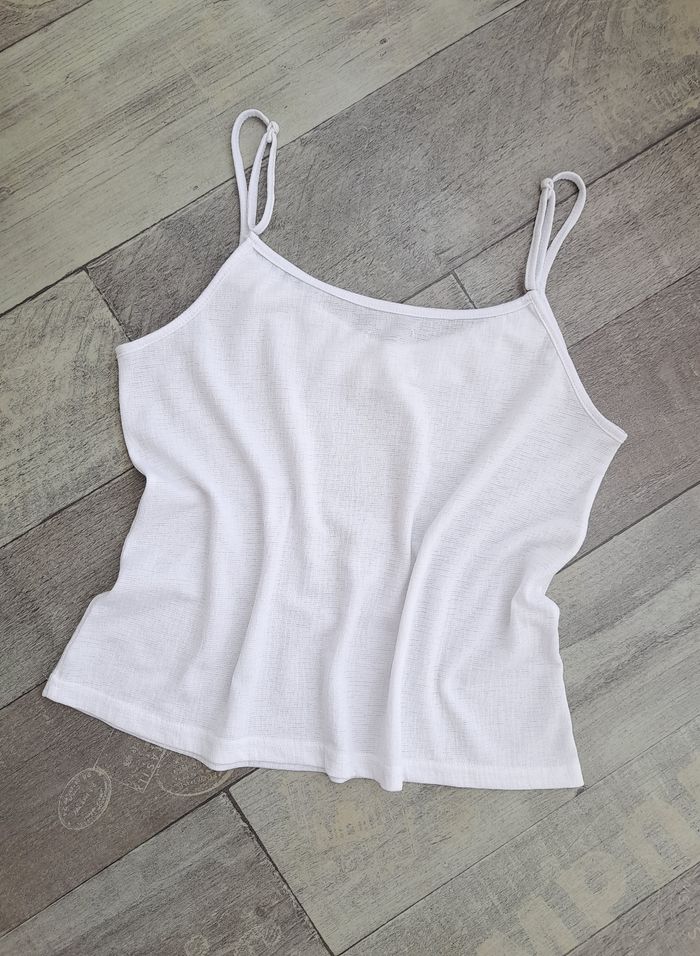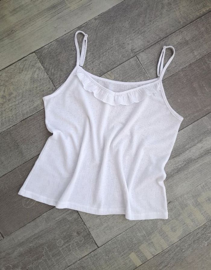 Débardeur fines bretelles blanc à volant • Décolleté en V • Bretelles réglables • Matière gaufrée • Taille 36 ➥ Deux petites reprises au dos à peine visible (voir photos) sinon très bon état • Largeur aisselle 43 cm • Longueur 53 cm environ