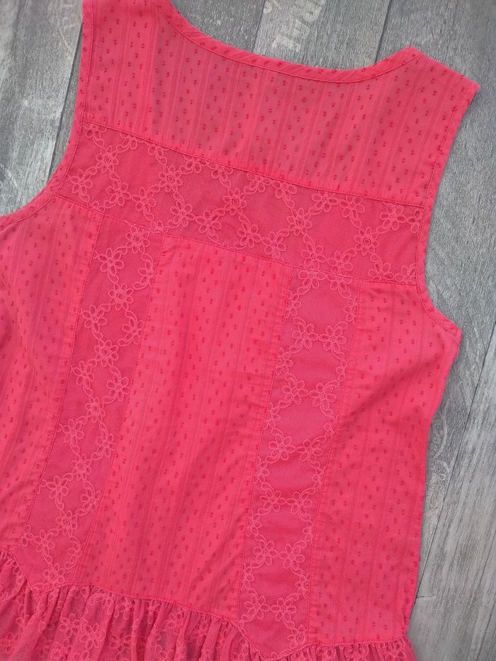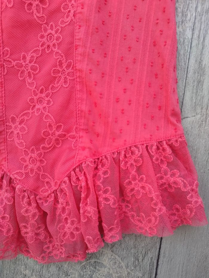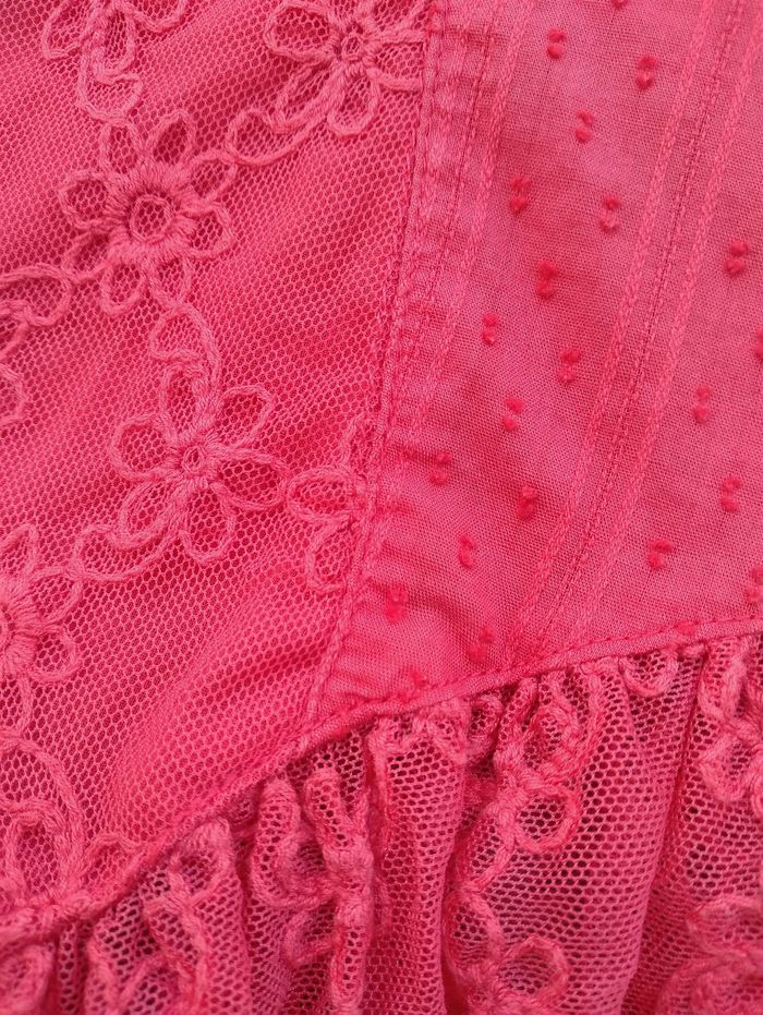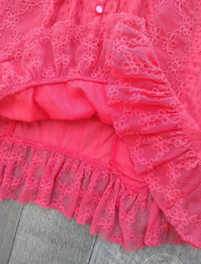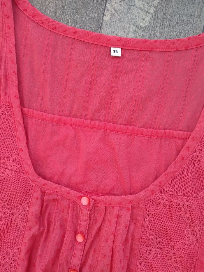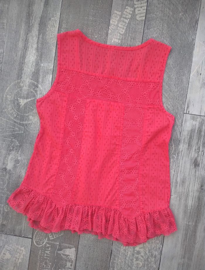 Chemisier blouse volanté à plumetis • Boutons fantaisies • Voile résille avec fleurs brodées • Taille 38 ➥ Très bon état • Largeur aisselle 43 cm • Longueur 62 cm