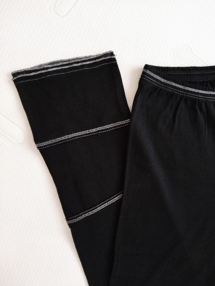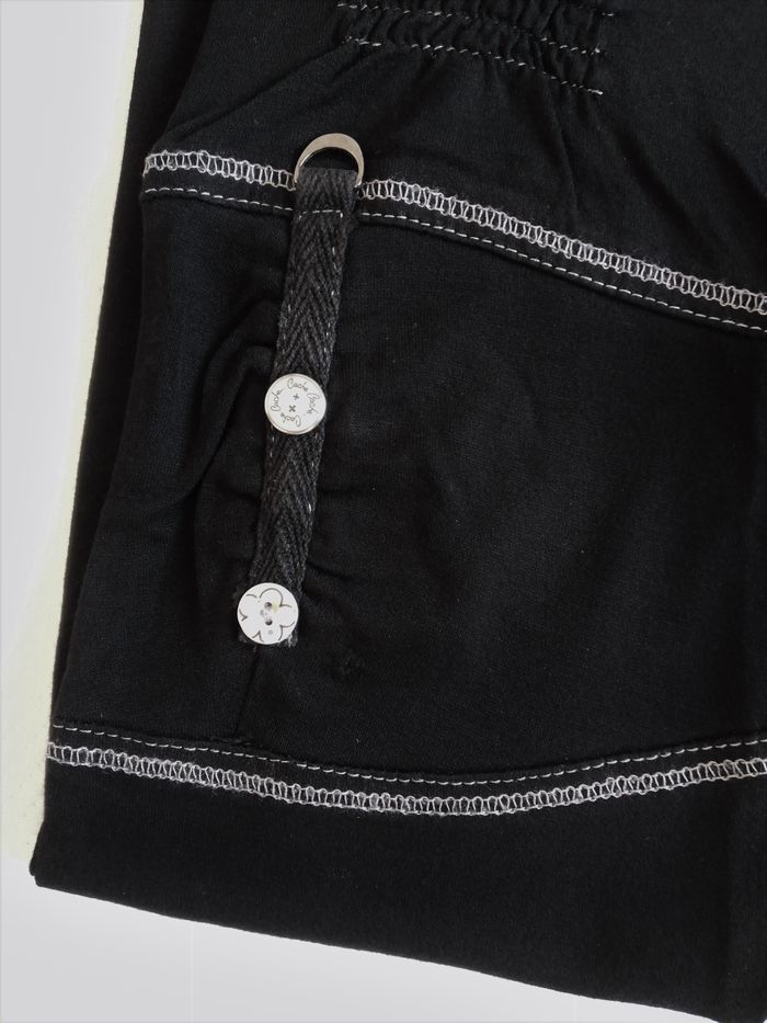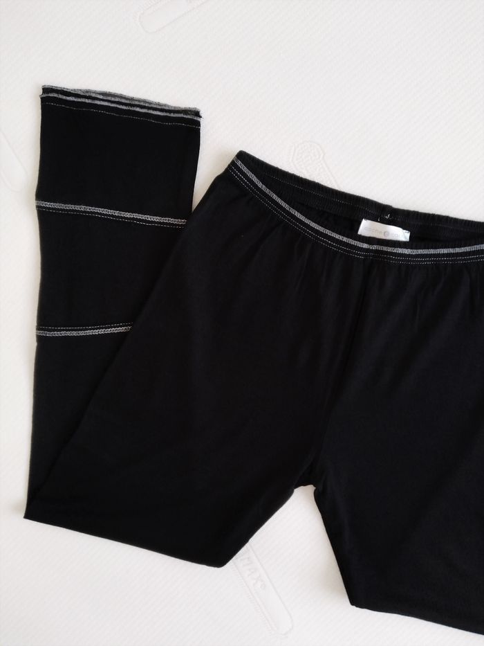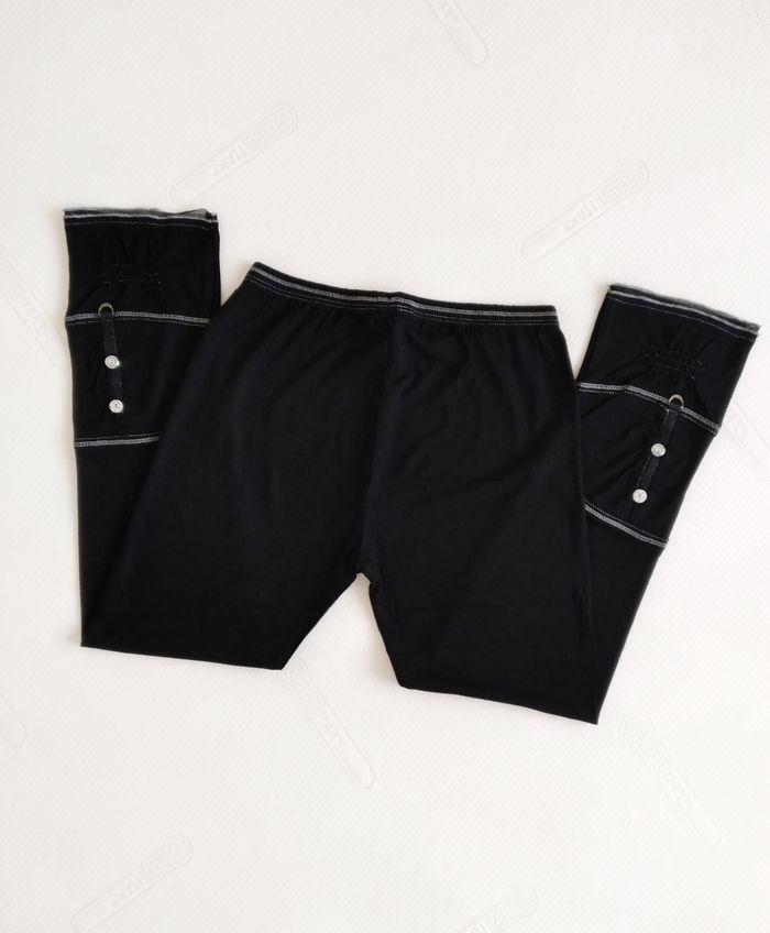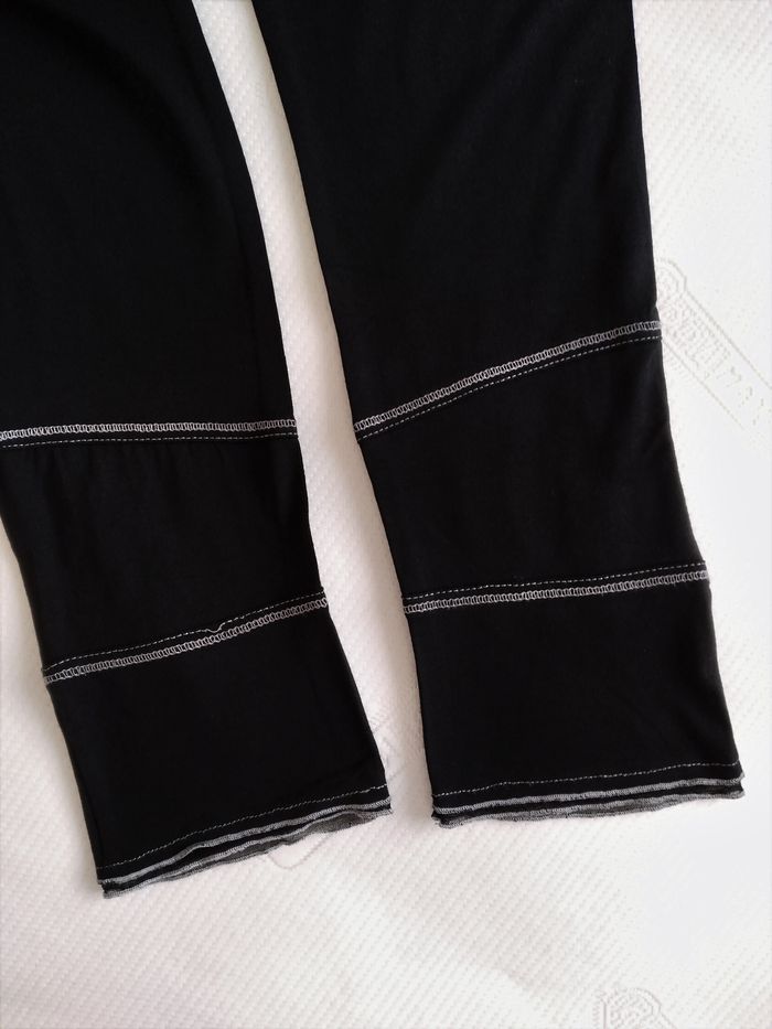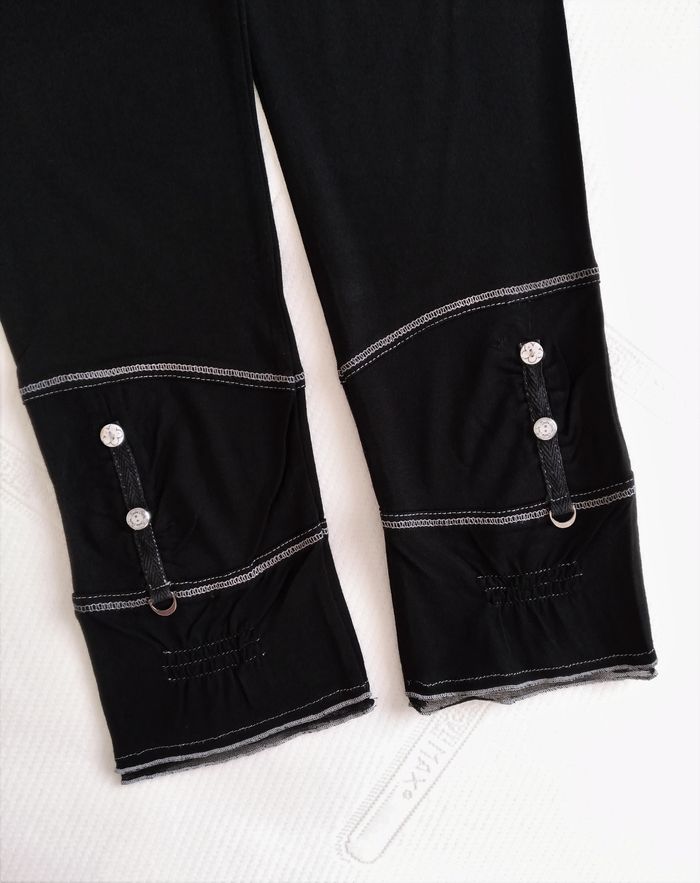Legging noir bas fantaisie - Cache Cache • Taille élastique • Coutures en zigzag grises • Résille en bas de jambe • Taille 34 qui peut convenir à un 36 ➥ Petit accro discret recousu au bas d'une jambe (voir photo) sinon excellent état • Tour de taille 58 cm • Longueur 77 cm • Profondeur avant 22 cm