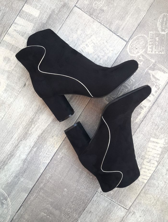 Bottines noires et dorées - Moony Mood • Pointure 38 • Tige et doublure en textile • Semelle intérieur cuir / extérieur synthétique • Hauteur talon 7,5 cm • Hauteur tige 11 cm ➥ Portées seulement quelques heures, comme neuve ➥ Valeur 60€