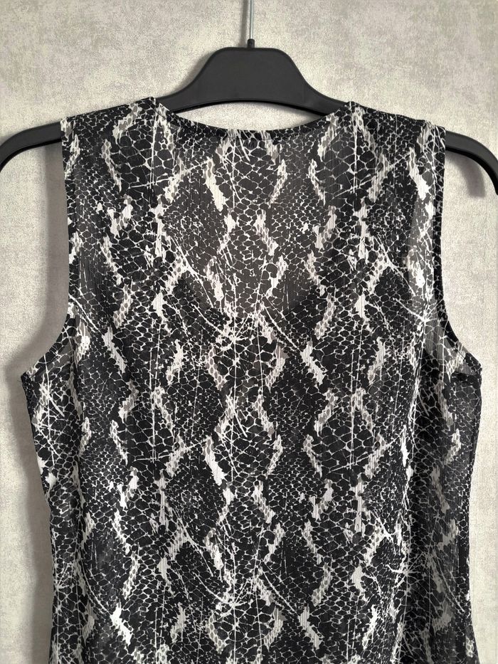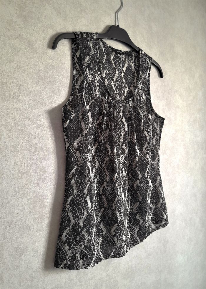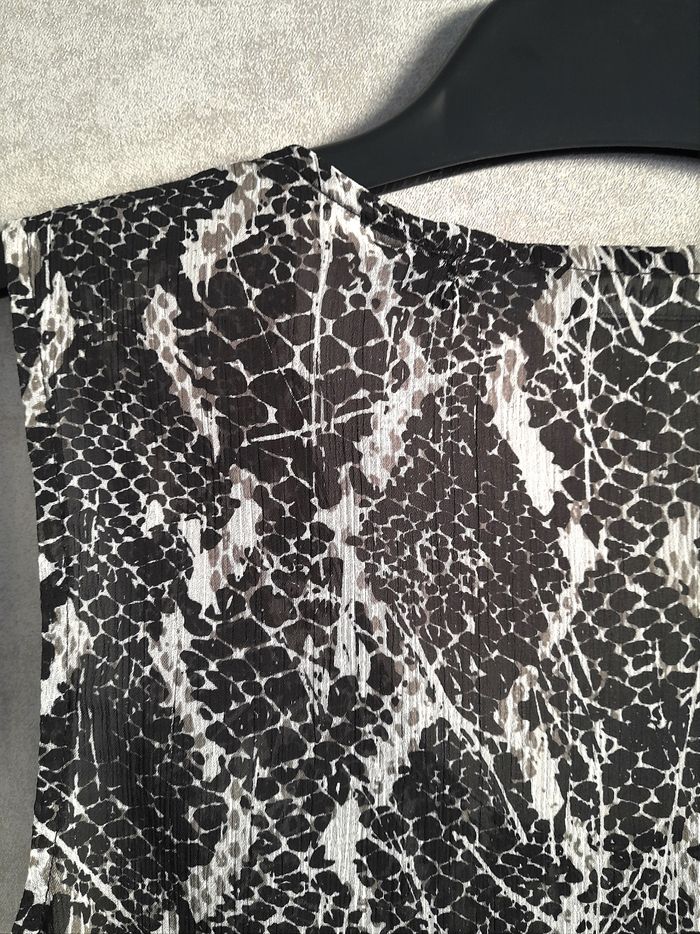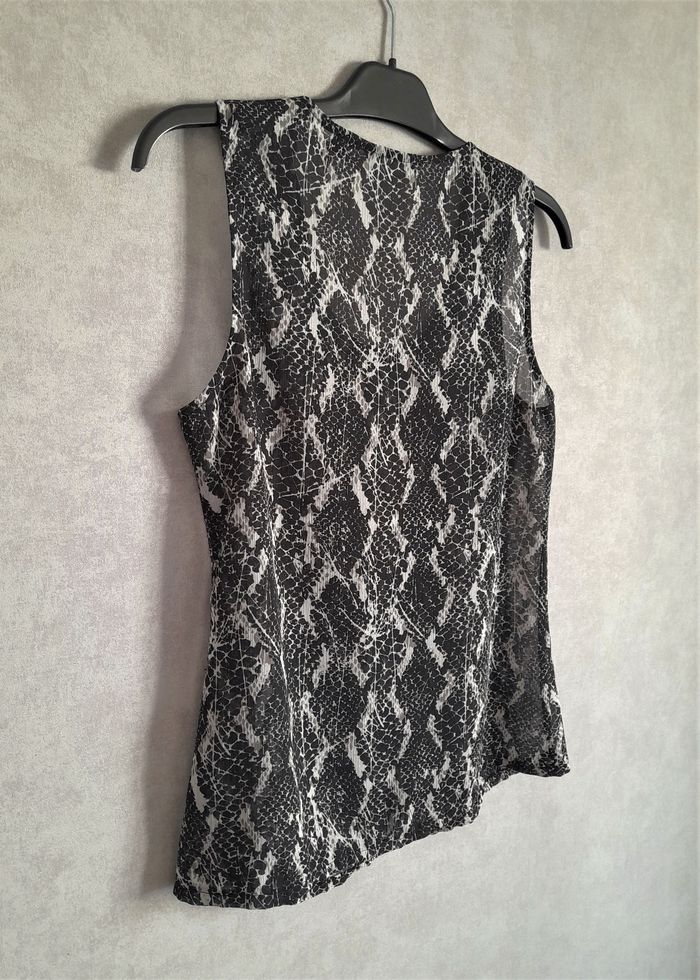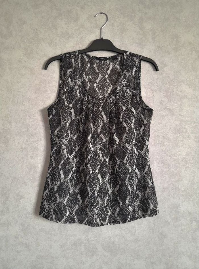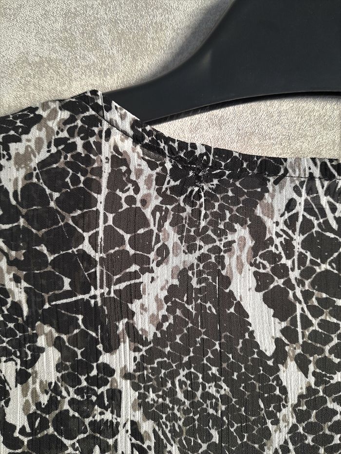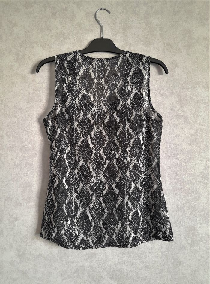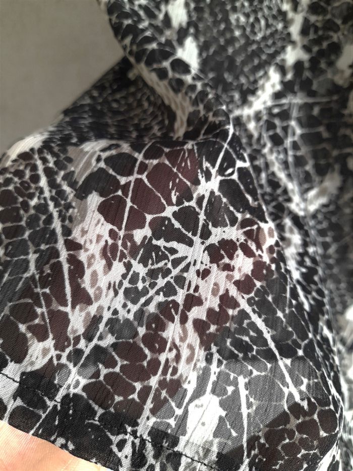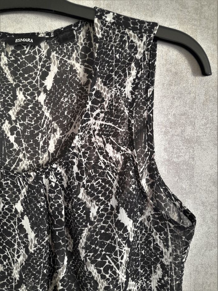 Blouse voile imprimé serpent - Esmara • Col arrondi finition froncé • Matière fluide et légère • Voile semi-transparent • Taille 38 ➥ Petite reprise sur le haut du col à l'arrière (voir photo) • Largeur aisselle 45 cm • Longueur 61 cm