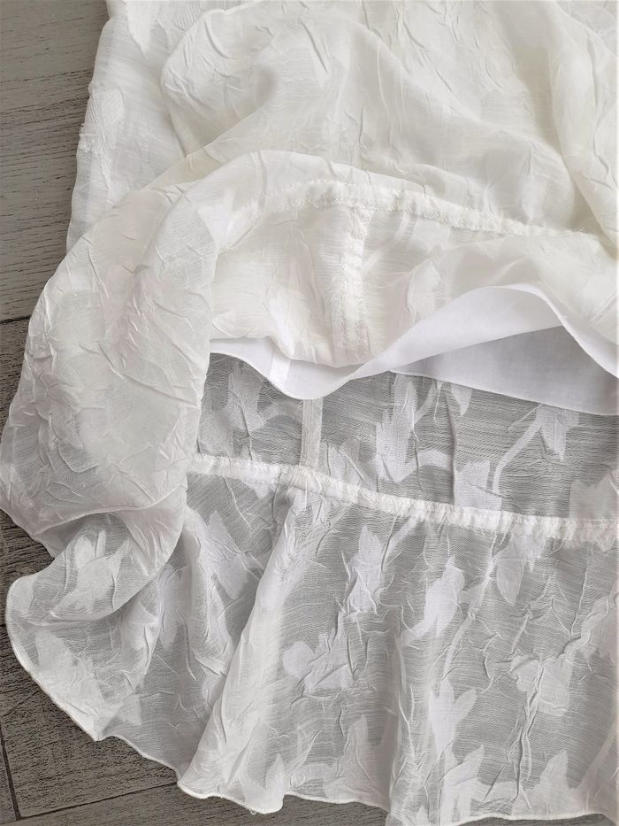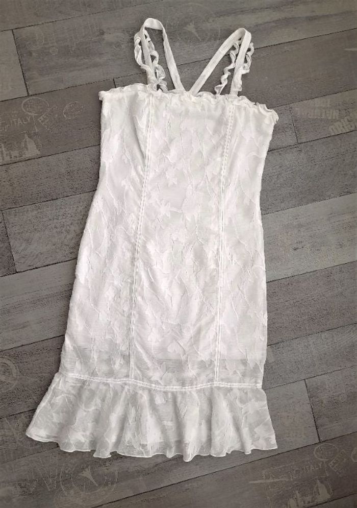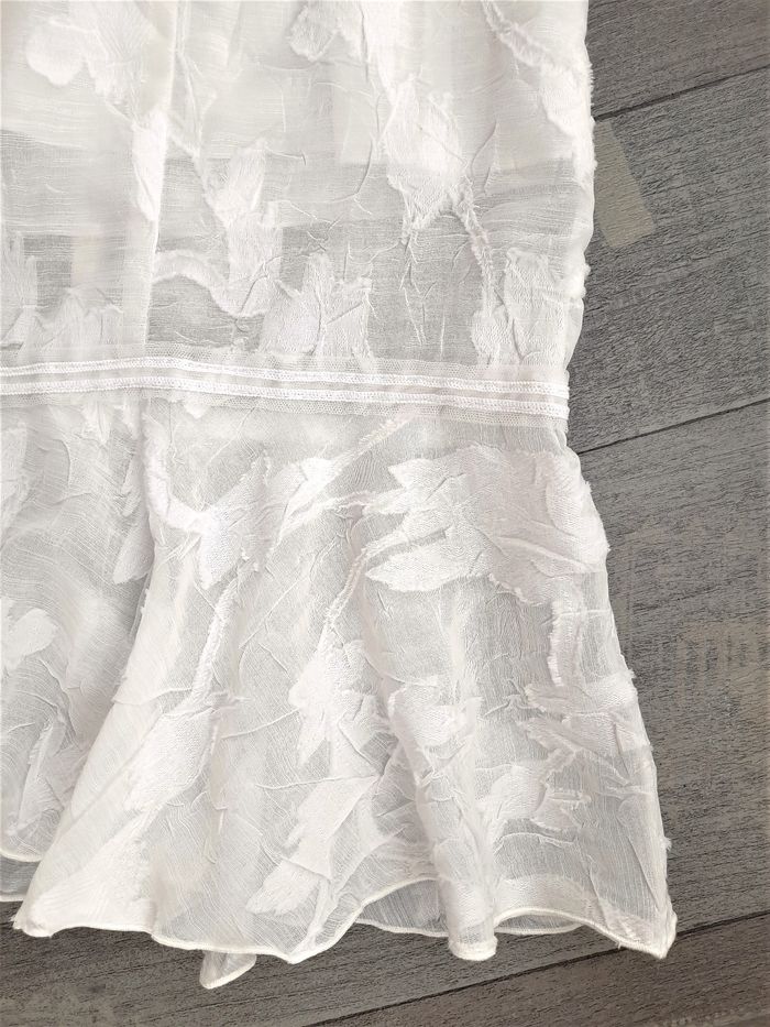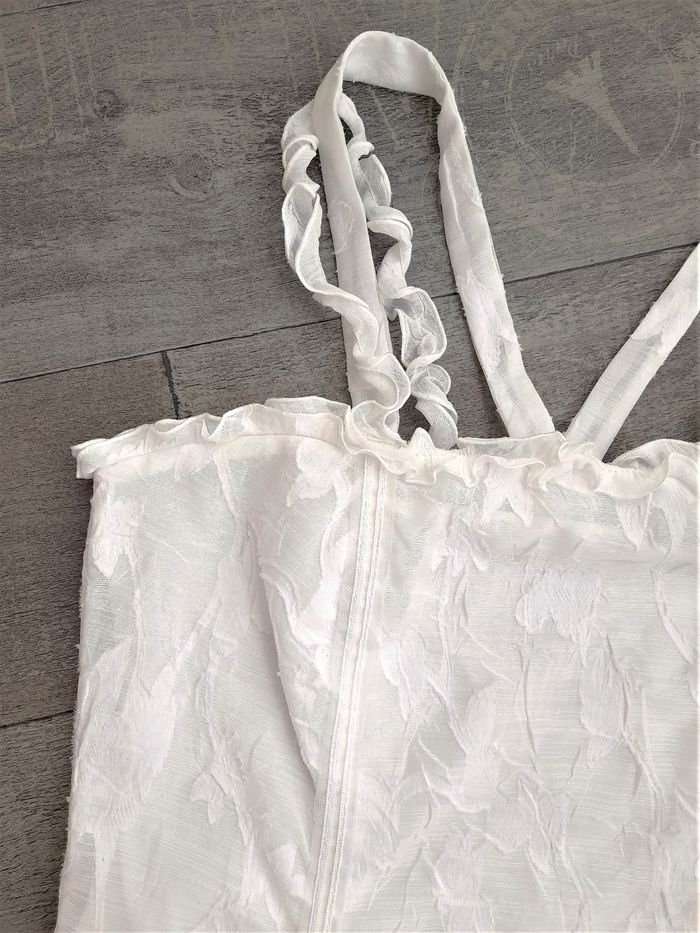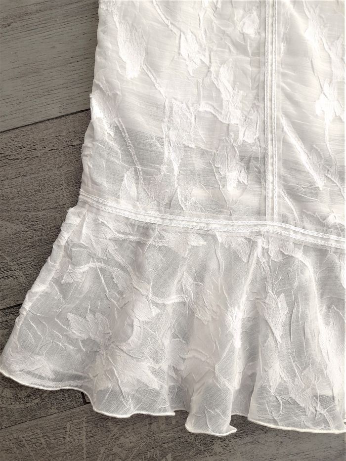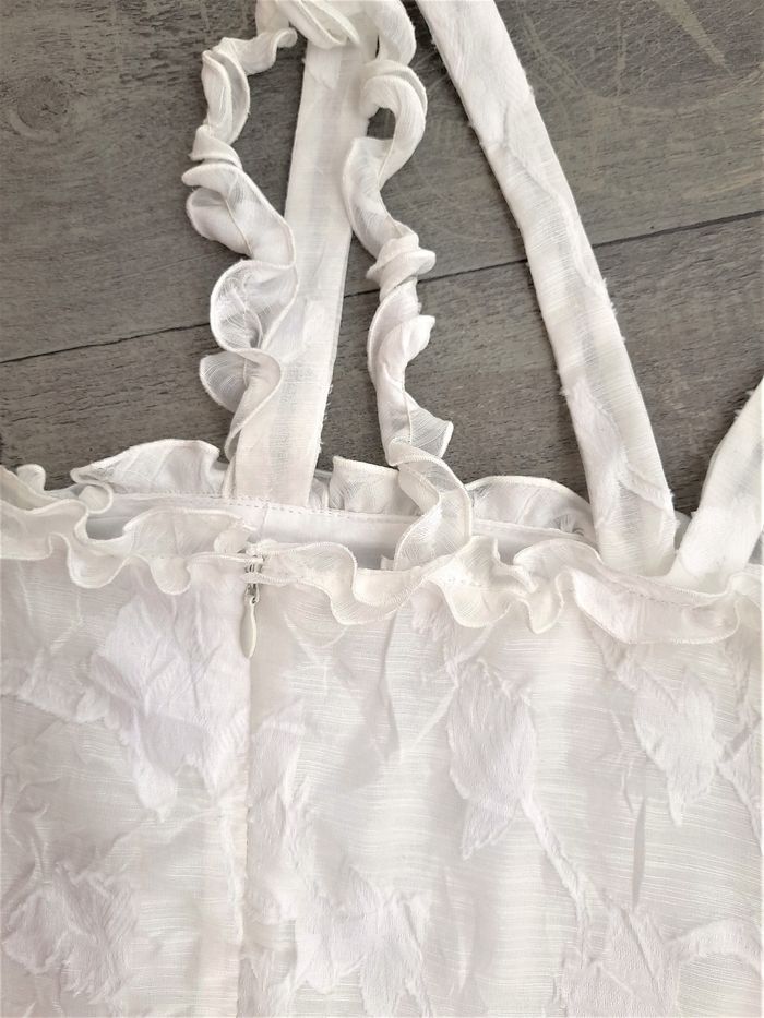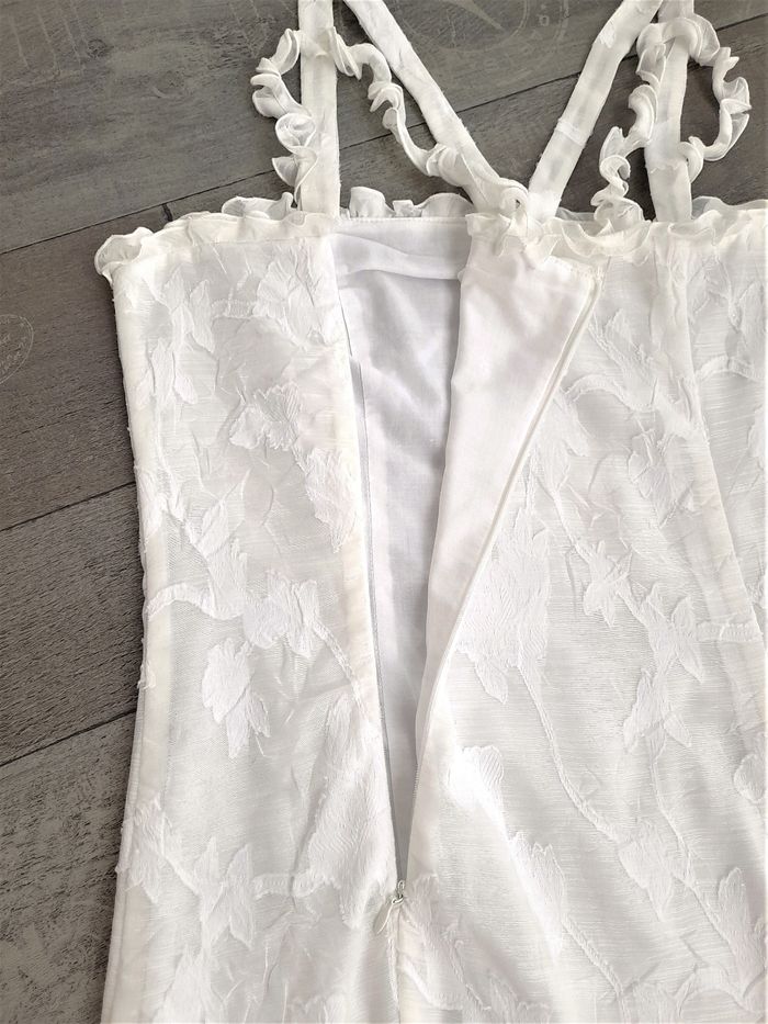 Robe de cérémonie blanc cassé à motifs ton sur ton • Bretelles torsadées et bretelles plates, croisées au dos (2 cm de large) • Fermeture invisible • Liseré en tulle à l'avant et au bas au dessus du volant • Doublure intégrée • Taille 38 ➥ Portée une fois ! Etat comme neuve ➥ Valeur 150€ ⇝ Possibilité de réajuster la longueur des bretelles plates en cas de besoin • Largeur aisselles 44 cm • Largeur taille 41 cm • Largeur hanches 52 cm • Longueur totale 89 cm / volant 15,5 cm / zip 32 cm