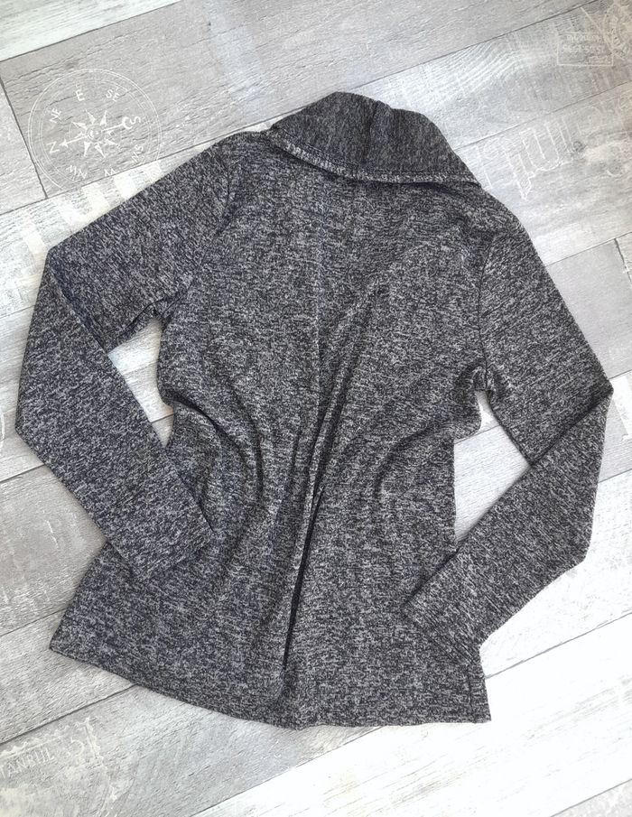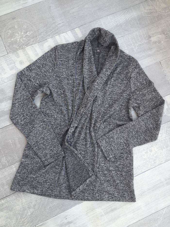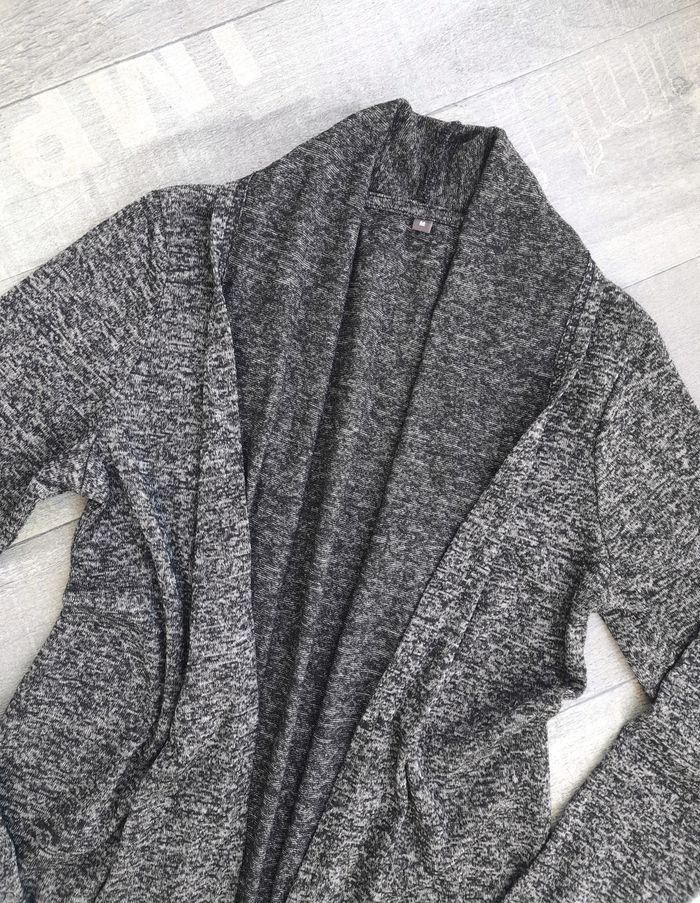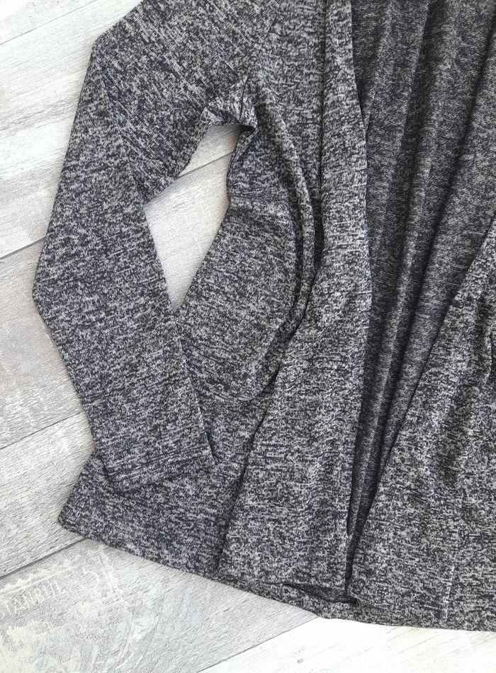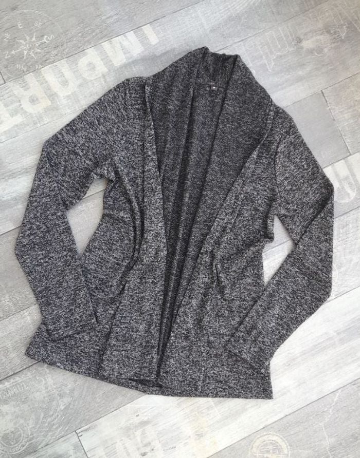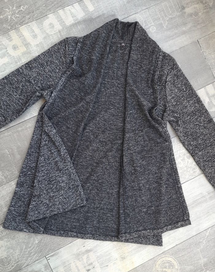 Cardigan / Gilet long ouvert • Ouverture libre • Coloris gris chiné foncé • Taille 38 (M) ➥ Excellent état, proche du neuf • Largeur épaule 35 cm • Largeur aisselle 45 cm • Longueur 65 cm ➤ Envoi possible