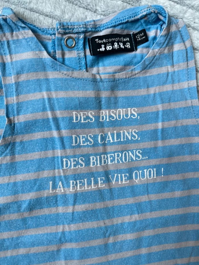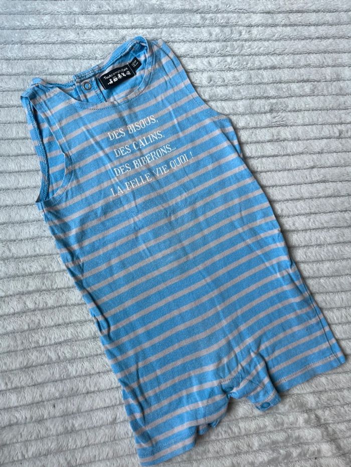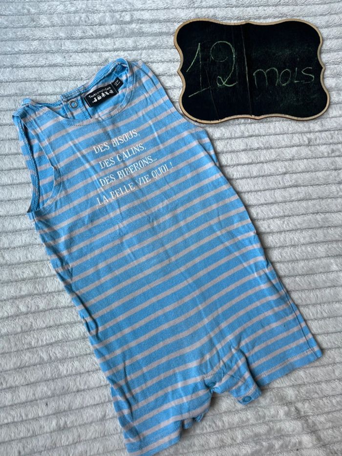 #lucie190510bebegarcon12mois 💥 barboteuse 💥 sans manches 💥 rayée bleu et gris 💥 tout simplement 💥 boutons pression à l’entrejambe 💥 taille 12 mois 💥 très bon état 📦 envoi rapide et soigné 🍀 réduction sur les lots activée