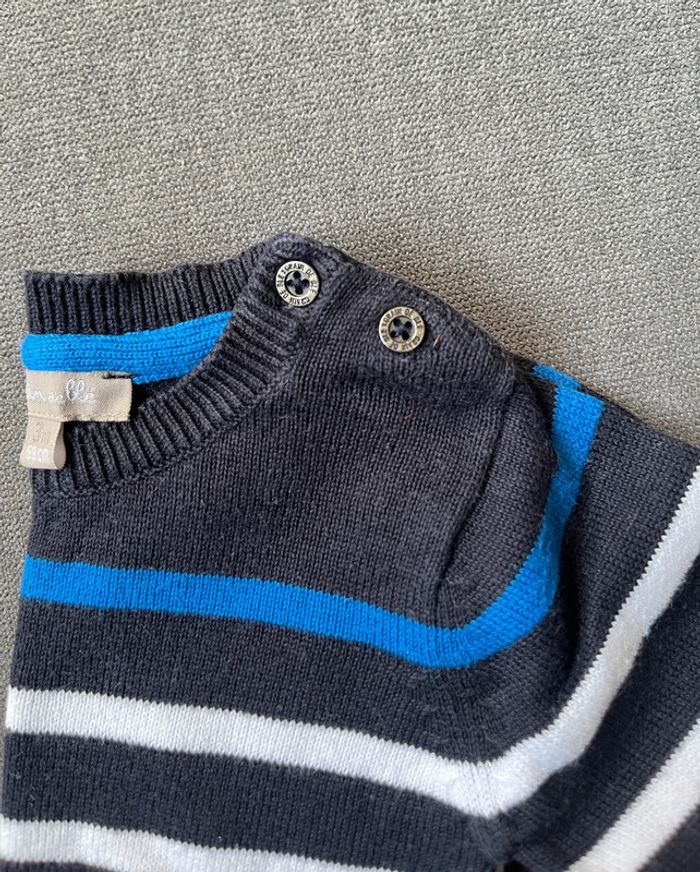 Pull bleu marine rayé de marque Grain de blé taille 3 mois en très bon état. Boutons sur le col pour faciliter le change. #lucie190510bebegarcon3mois