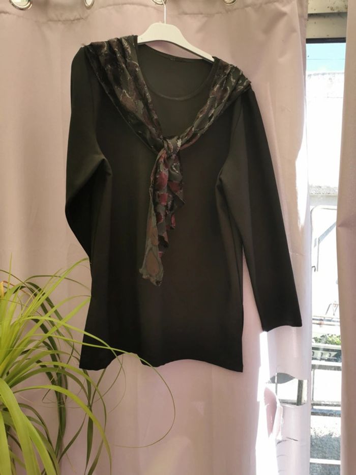 Tunique de fête en 40 noire Echarpe tenant à la tunique nouable à votre guise Sympa pour les fetes Fendue sur les côtés Longueur 73 cms Reduction en lots activée Envoi rapide et soigné J accepte les offres dans la limite du raisonnable N hesitez pas à vous abonner à mon profil souvent des nouveautés