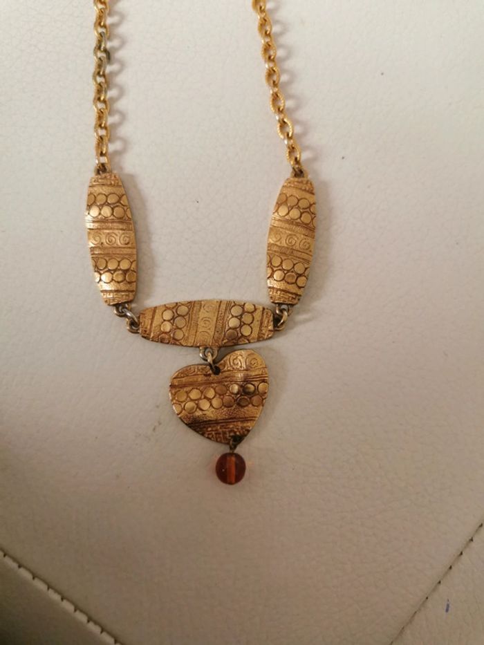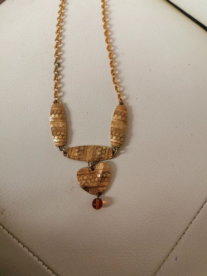 Collier style aztèque Avon Sympa pour les fetes avec une jolie tenue Class 27 cms de hauteur Cœur et petite perle couleur ambre Reduction en lots activée Envoi rapide et soigné J accepte les offres dans la limite du raisonnable N hesitez pas à vous abonner à mon profil souvent des nouveautés