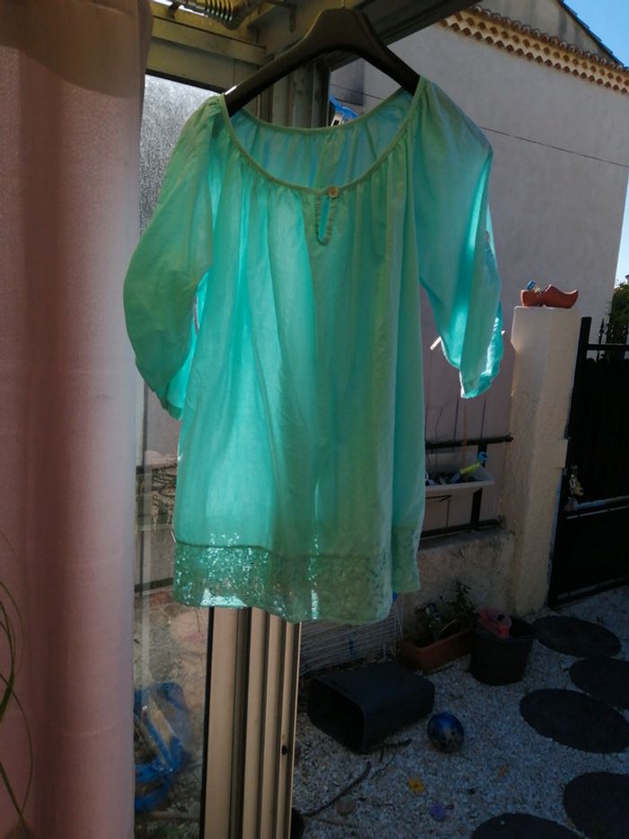Jolie tunique vert d'eau, raglan, dentelle en bas, 60 CMS aisselle à aisselle...bouton nacré, manches serra les ou pas..très confortable