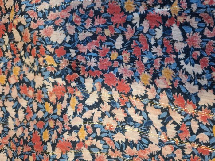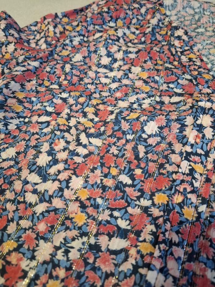 Belle blouse pour femme, marque CAMAÏEU, taille L, tissu léger fleuri tons rouges/bleus/jaunes, col V, manches longues fermées par petit bouton bleu marine, légères rayures dorées horizontales très discrètes, en 99 % viscose et 1 % fibre métallisée, lavable en machine à 30°, bouton de rechange cousu sur étiquette intérieure et en excellent état, peu portée.