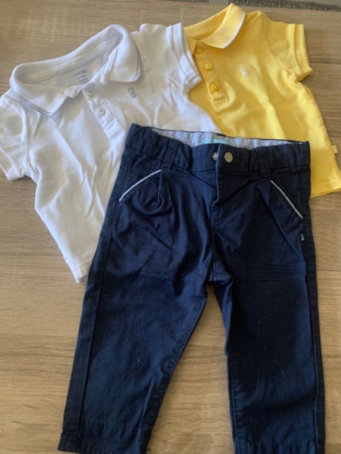 6 mois , très bon état ; 2 polos 1 blanc et l autre jaune , avec pantalon bleu marine