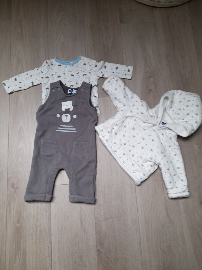 Bonjour je vend en très bon état taille 3 mois un ensemble ( t-shirt, salopette et veste )
