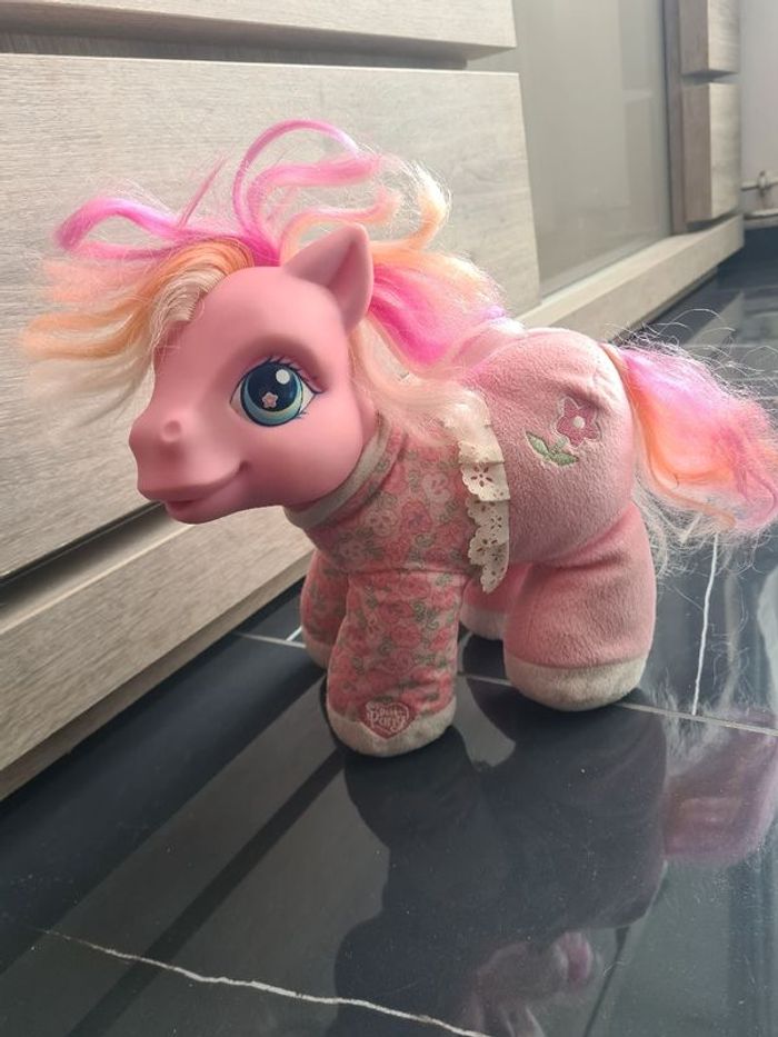 My little pony Vendu en 2004 Fait des sons lorsqu'on pose un biberon dans la bouche ou lorsqu'on appuie sur le coeur situé sur sa patte Je n'ai plus ce biberon mais les sons s'activent quand l'objet touche le bouton Fonctionne avec 2 piles AAA Maison non fumeur