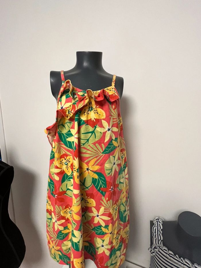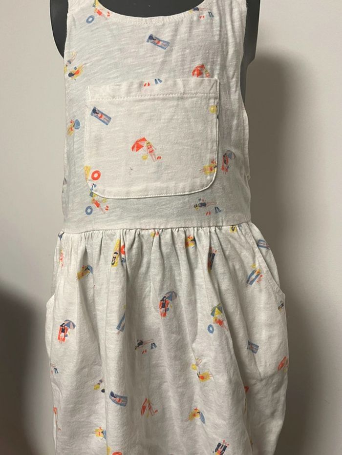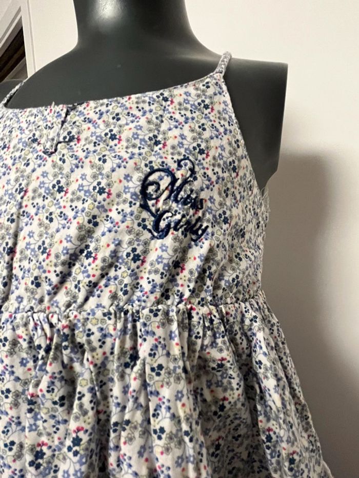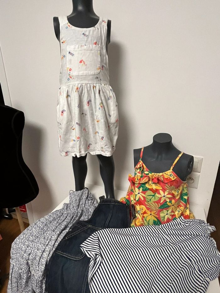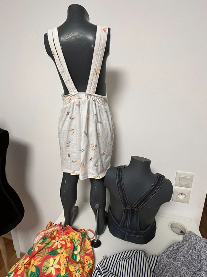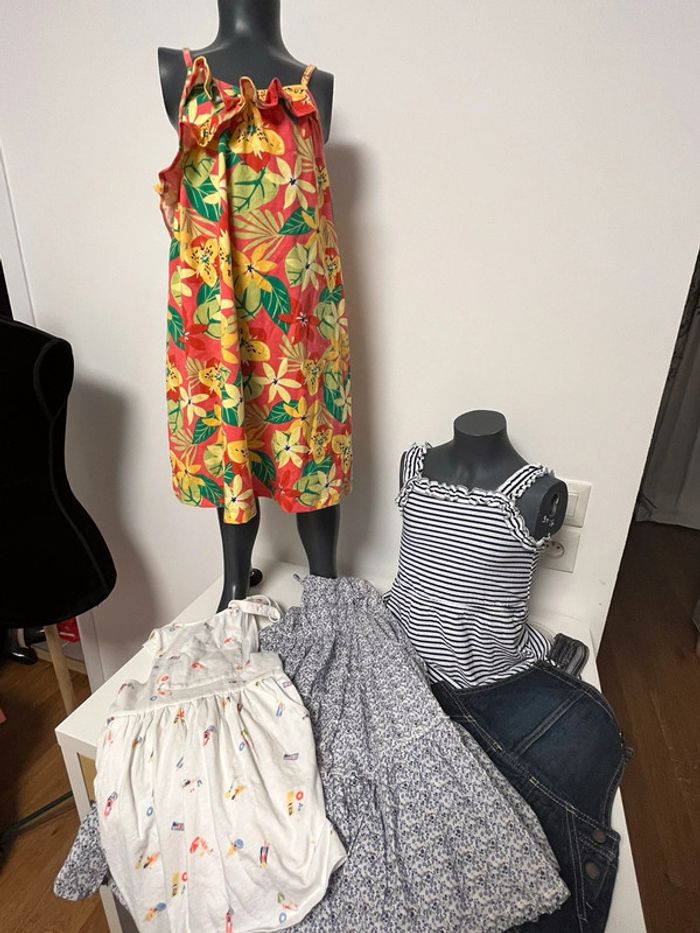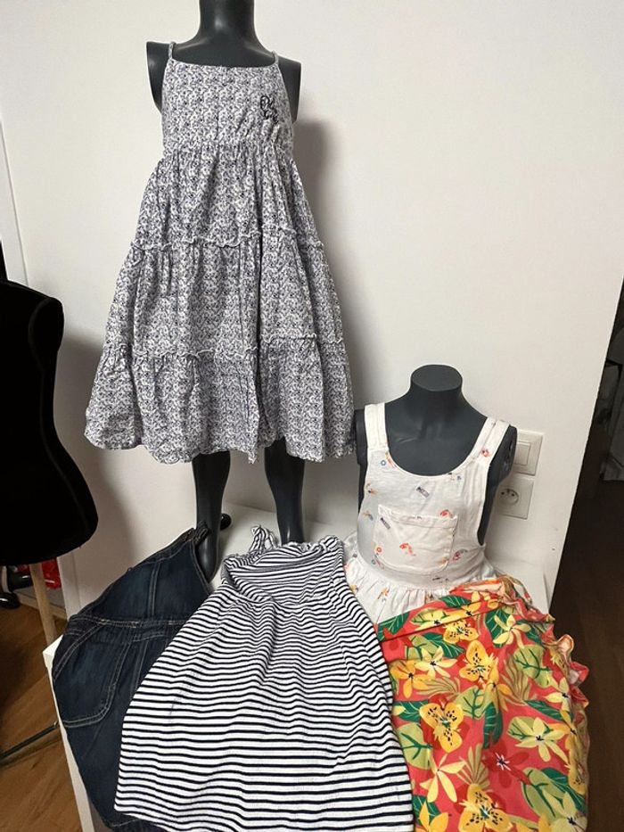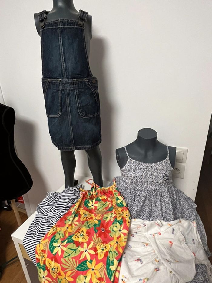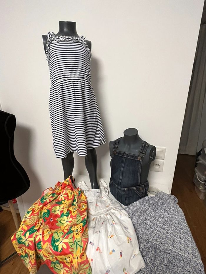 Lot de 5 robes en taille 6 ans - une robe salopette en jean de marque kiabi - une robe salopette blanche avec motifs de marque kiabi - .une robe bretelle blanche avec motifs petites fleurs bleues de marque miss Gurly - une robe marinière de marque kiabi - une robe à bretelles colorés avec volants en hauts sans marque TBE #framboise83f6