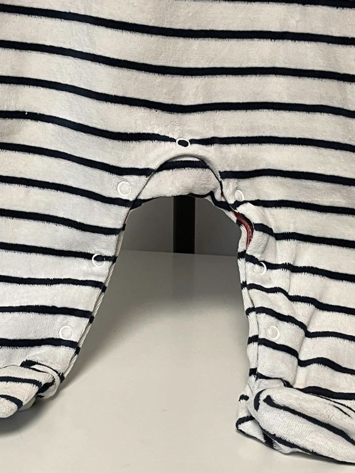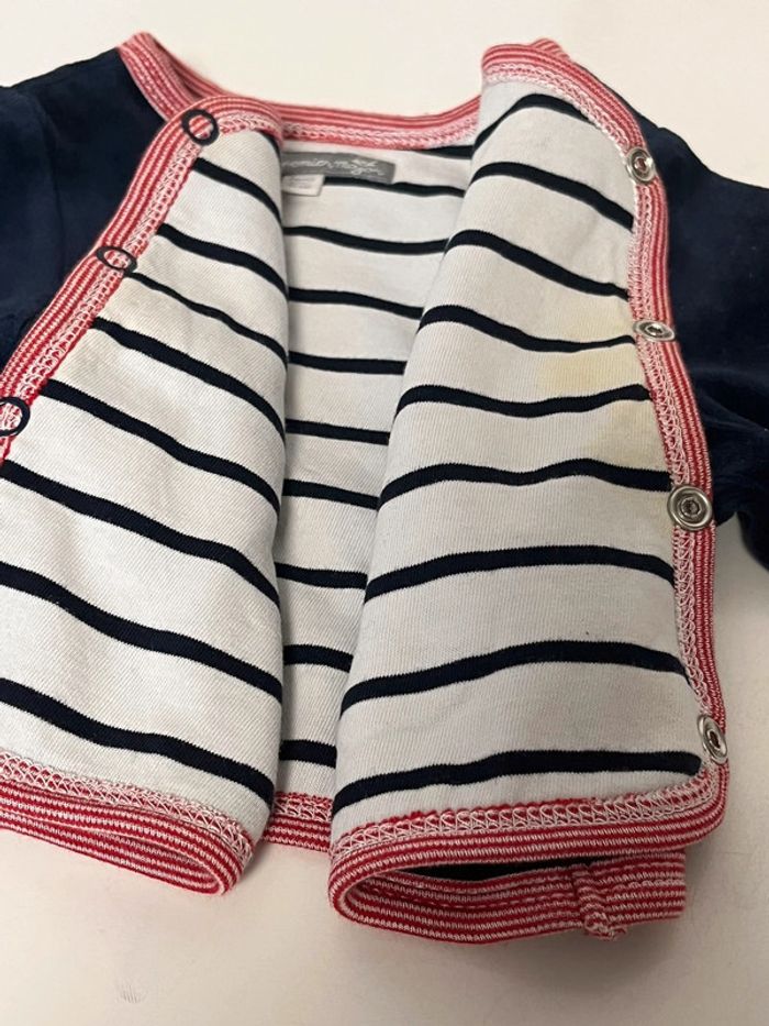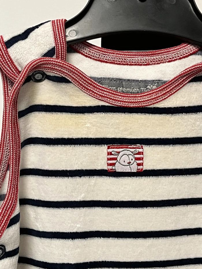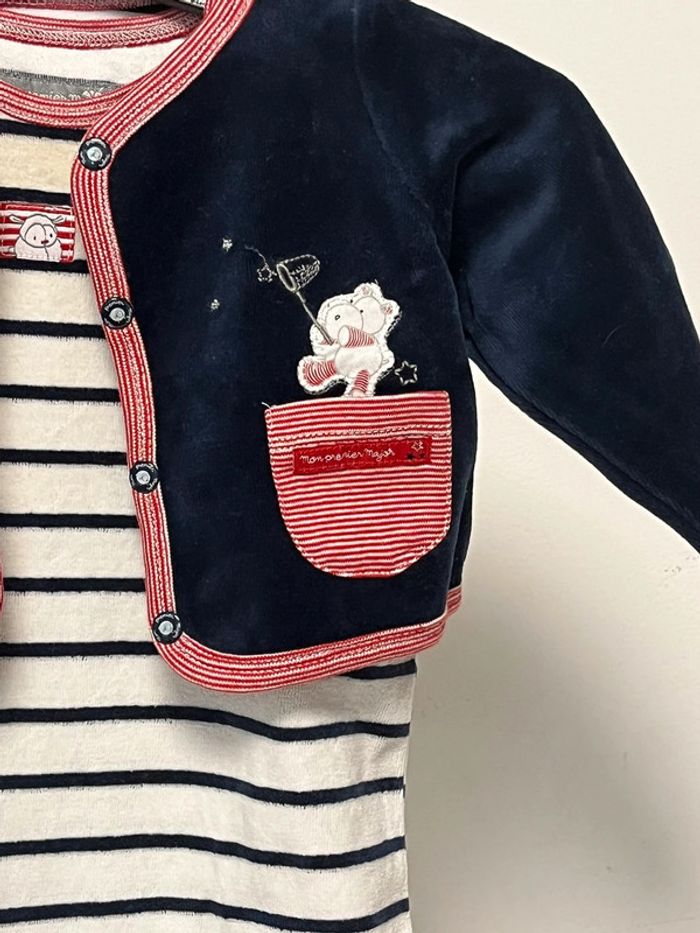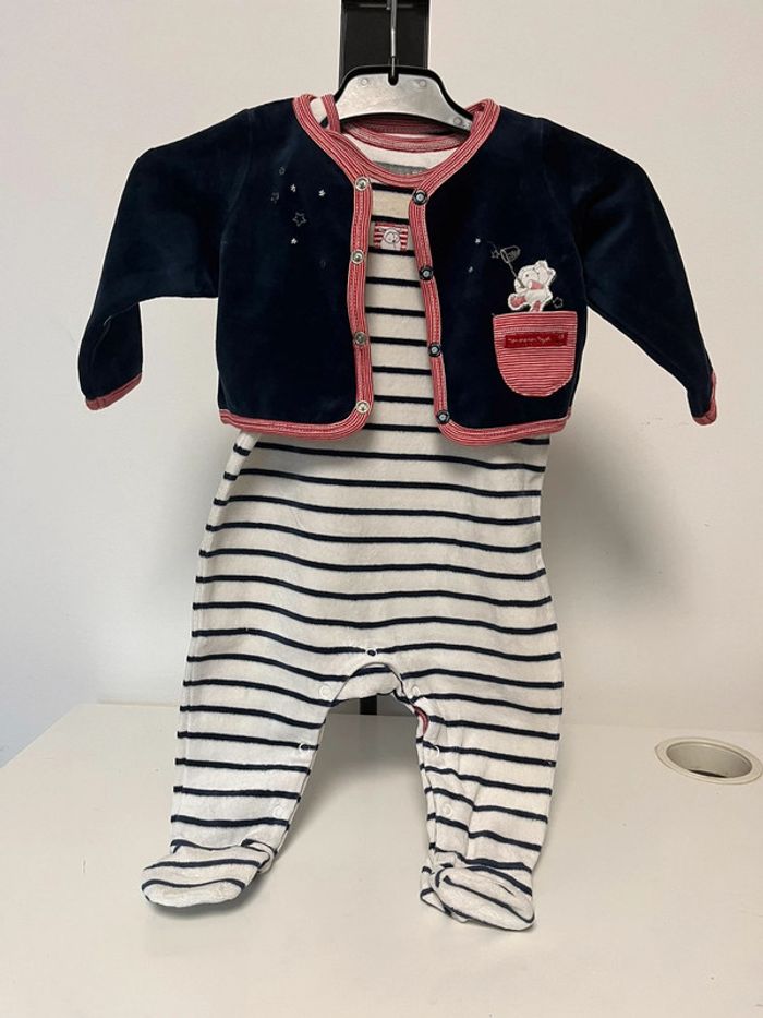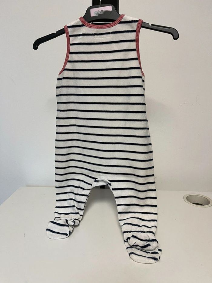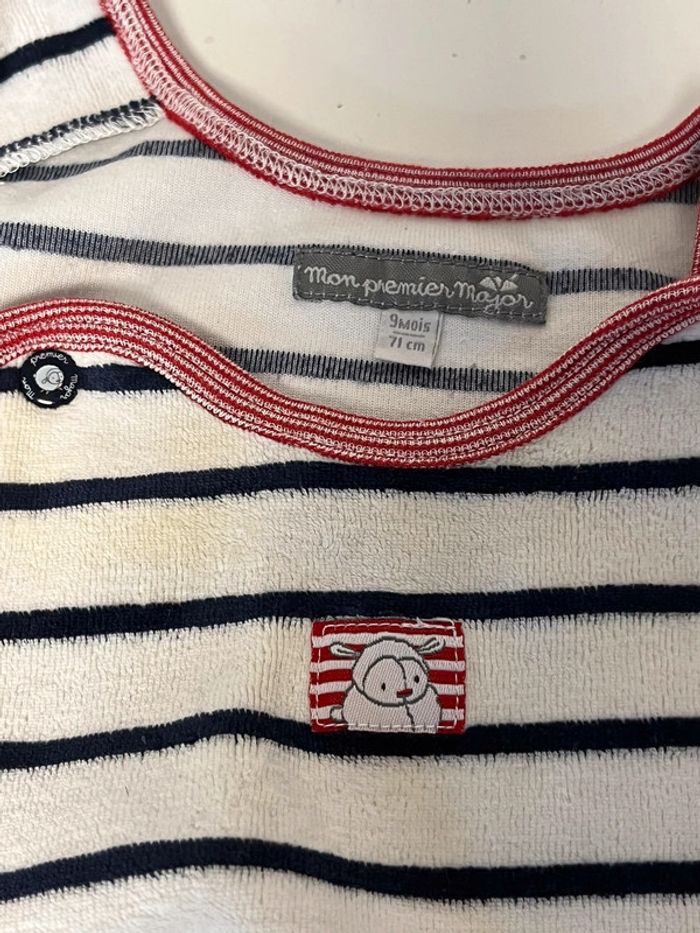 Ensemble avec une grenouillère sans manches et son gilet, idéal demi-saison Taille 9 mois Marque Sergent Marjor A noter il a jaunit au niveau du col et a l’ intérieur de la veste comme montré sur les photos, mise à part ça il est en TBE #framboise83gneufmois