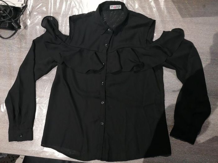 Marque In&dit Chemise noire manches longues avec épaules dénudées Volant au niveau de la poitrine Chemise très légère