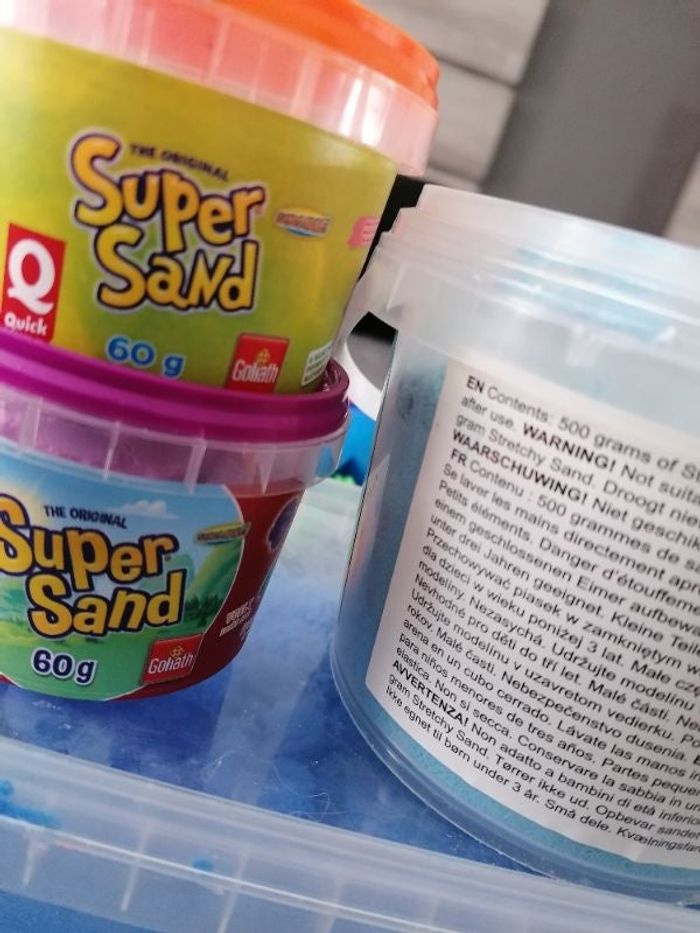 Environ 500g de Super Sand bleu foncé Environ 500g de Super Sand bleu clair Environ 60g de super sand violet Environ 60g de super sand orange Et 17 éléments pour jouer avec