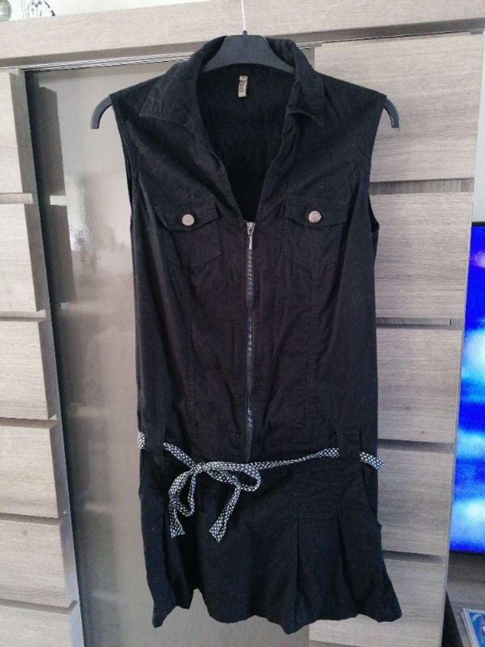 Robe noire sans manches avec ceinture bleu à pois blancs Fermeture de 40cm sur le devant 2 poches au niveau de " la jupe" Aisselle / aisselle environ 48 cm Col / bas environ 97cm Marque : spot