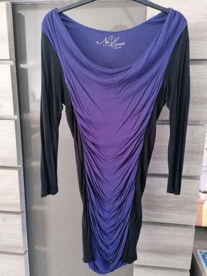 90 cm col / bas Effet amincissant, ceintré de haut en bas Taille 42 /44 Manches longues