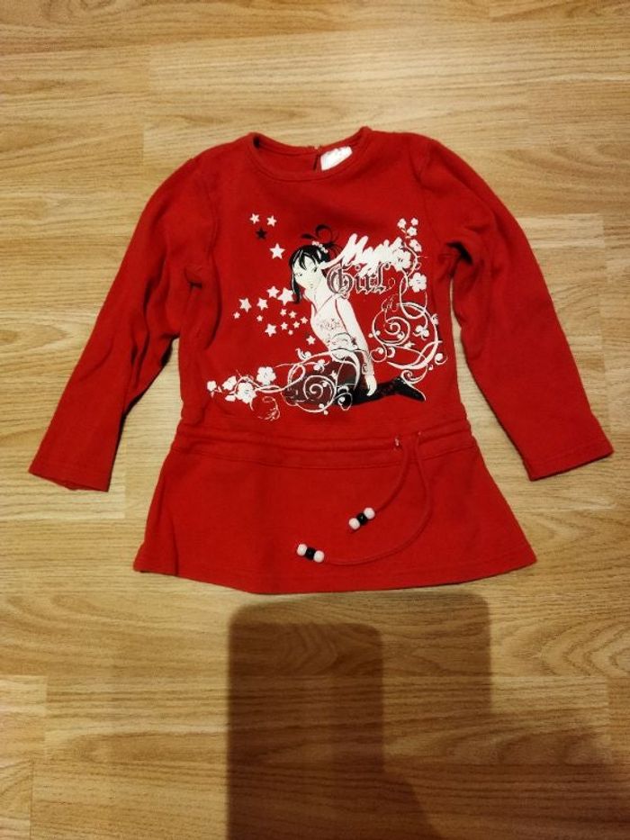 Tee-shirt 4 ans rouge manches longues fermeture par 1 bouton dans le dos cordon au niveau de la taille pour resserrer présence d'une petite tâche dans le bas du dos