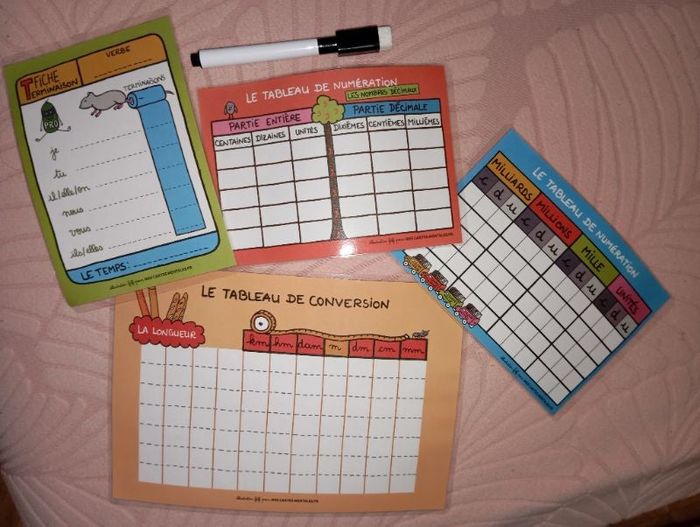 Lot de 4 fiches de révisions plastifiées (tableau de conversion, 2 tableaux de numérations dont un avec les nombres décimaux, fiche terminaisons pour les verbes) + le feutre ardoise noir NEUF, où les enfants peuvent écrire et effacer avec des feutres pour tableaux blancs. 5,50€ les 4 feuilles plastifiées + le feutre effaçable. (En sachant que sur le site, la fiche de révision plastifiée est vendu a 2,50€ l'unité, soit 10€ les 4 fiches plastifiées).