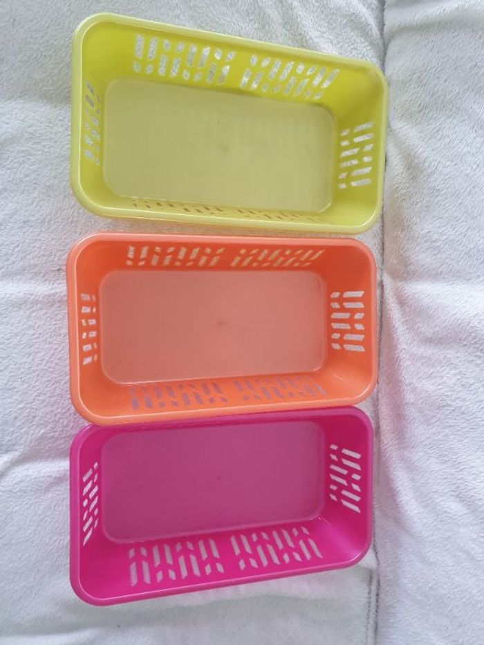 Lot de 3 paniers en plastique rose, orange et jaune. Ajouré sur les côtés. Ils mesurent environ 35cm de long, 20cm de large et 8cm de haut.