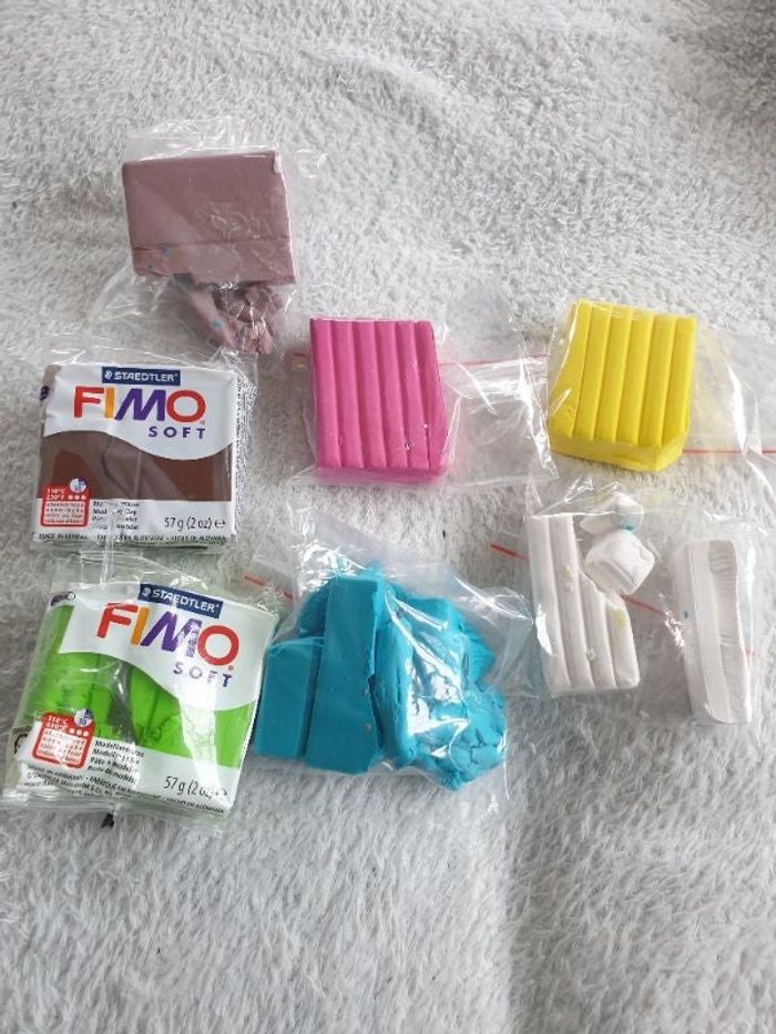 Lot pate à modeler Fimo. Chocolat, vert pomme, turquoise, jaune soleil, Fuchsia, taupe, blanc Ils ont été déballé et il manque un morceau mais peuvent encore être utilisé.