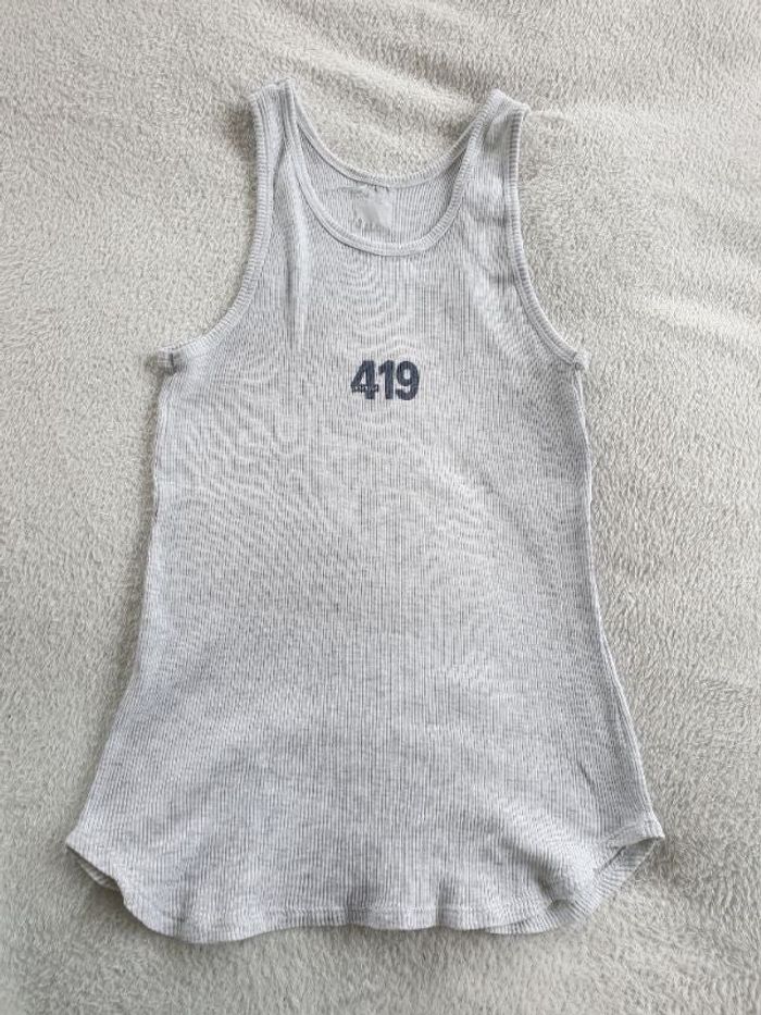 Debardeur larges bretelles. Taille 3, M. Tissu gris chiné a cotes. Des annees 80-90. Très bon état.