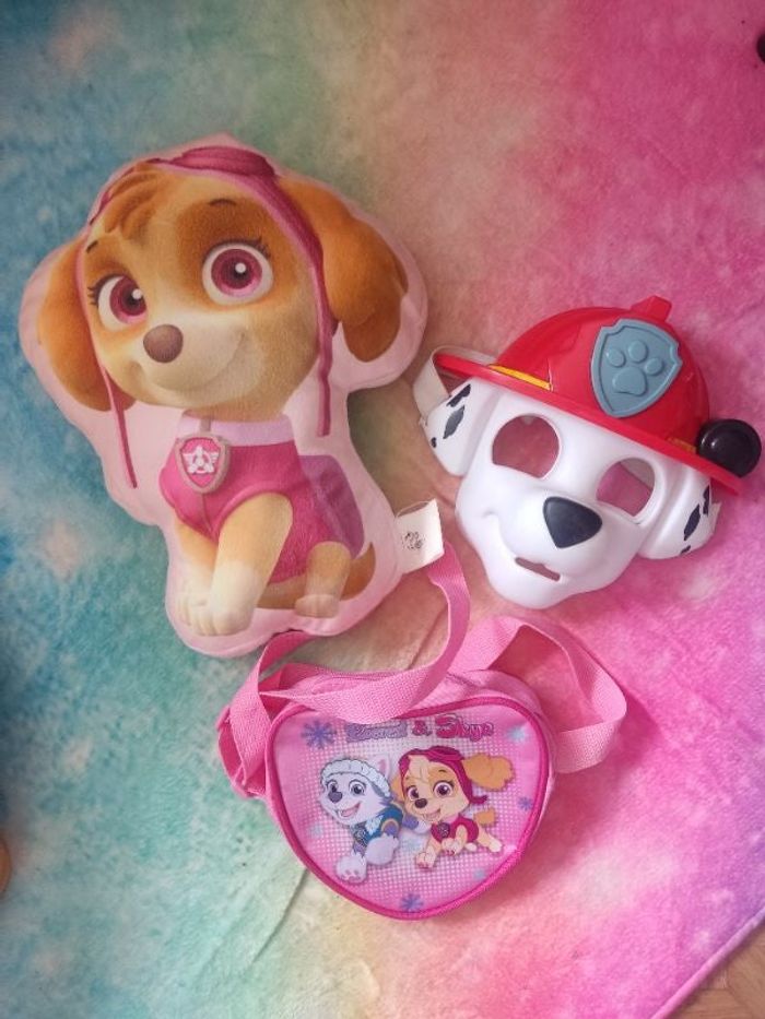 Lot 3 accessoires pat patrouille dont un coussin Stella très bon état, un masque Marcus en bon état, et une sacoche bandoulière Stella neuve jamais utilisé. 9,50€ le lot.