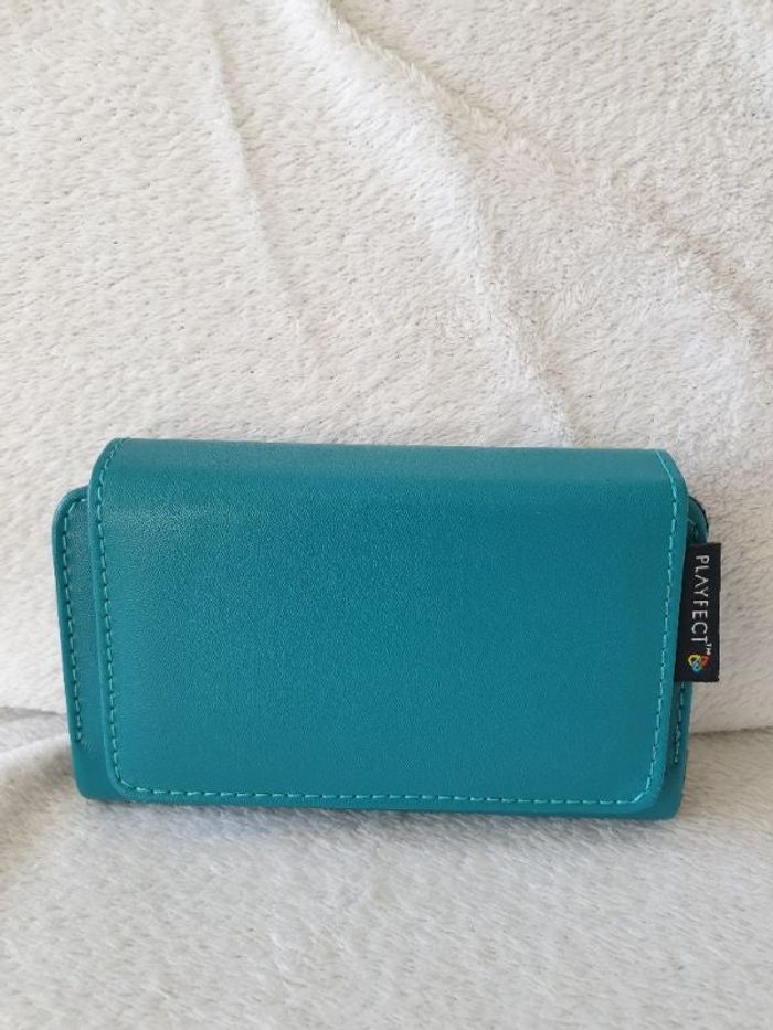 Petite pochette pour Nintendo DS et 3 jeux. La pochette mesure environ 14,5cm de large, 9cm de haut et 3cm de large. Avec élastiques sur les côtés.