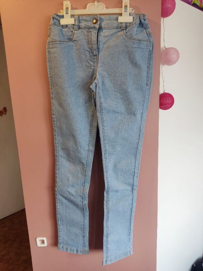 Jean slim bleu clair, réglable a l'intérieur, marque Kiabi, taille 10 ans, très bon état (mais léger défaut de fabrication sur le bas, qui y était déjà a l'achat) sinon pas de tâches ni trou. Porté a peine que 3 fois.