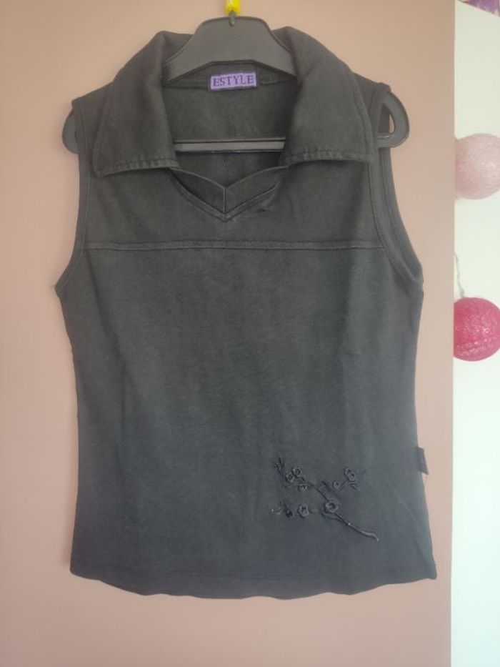 Haut noir sans manches, pas d'étiquette de taille a l'intérieur mais correspond à une taille 10 ans, très bon état sans défauts.