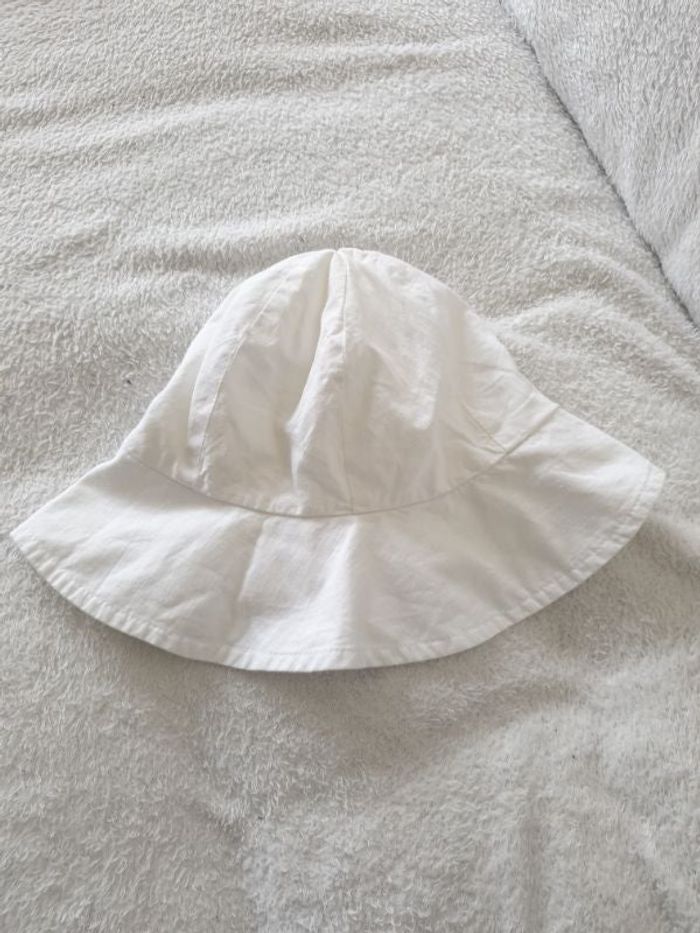 Chapeau blanc. Le bord de devant est plus long que derrière pour être bien protégé du soleil. Il mesure environ 50cm. Neuf.