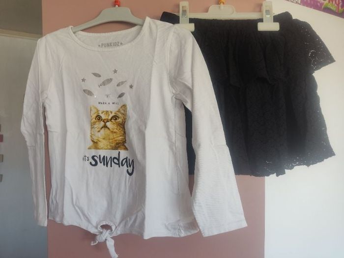 Ensemble tee shirt en bon état (minime défaut, voir photo) + jupe en très bon état sans défauts. Taille 8 ans, marque Punkidz. 6,50€ l'ensemble.