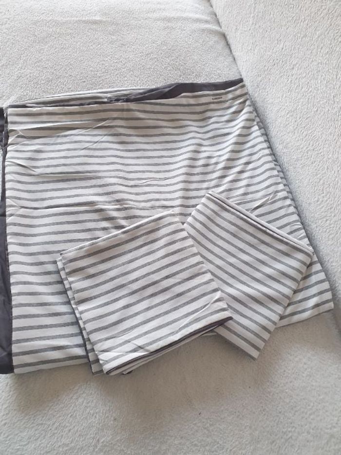 Parure de drap. Comprenant une housse de couette et 2 taies d'oreiller. La housse de couette mesure environ 200x200cm et les taies d'oreiller environ 65x65cm. Fond blanc et lignes grises d'un côté et gris de l'autre côté. Drap doux. La housse de couette se ferme avec des boutons voir photo.
