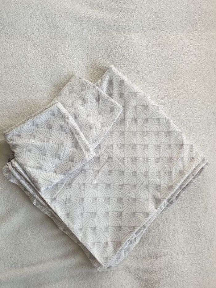 Parure de drap. Comprenant une housse de couette et 2 taies d'oreiller. La housse de couette mesure environ 200x200cm et les taies d'oreiller environ 65x65cm. Fond blanc et dessin gris d'un côté et fond gris et dessin blanc de l'autre côté. Drap doux. Le rabat est un peu abîmé dans le bas voir photo mais ne se voit pas vu qu'il est en dessous.