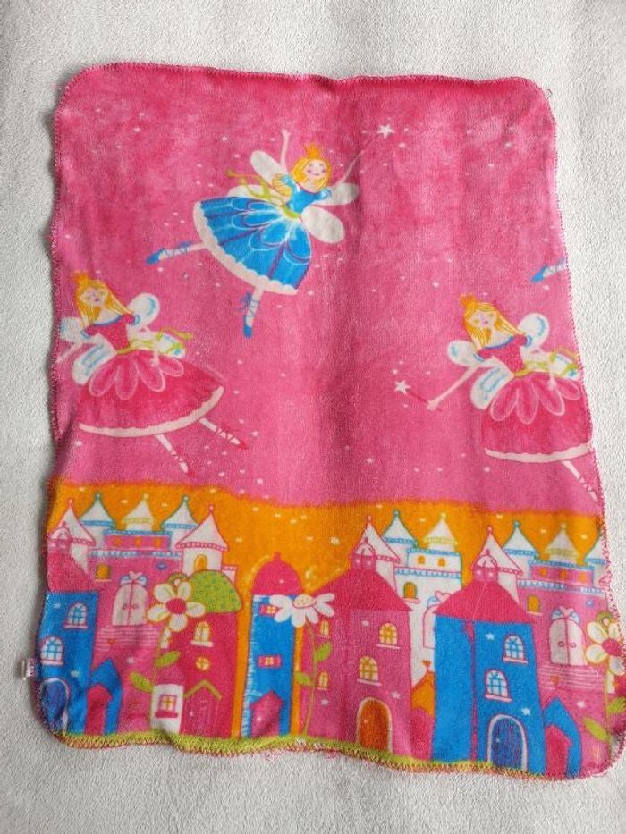 Plaid rose fées . Il mesure environ 110x85cm. Très epais et tout doux. Les coutures sur les côtés sont un peu tirées à plusieurs endroits voir photos.