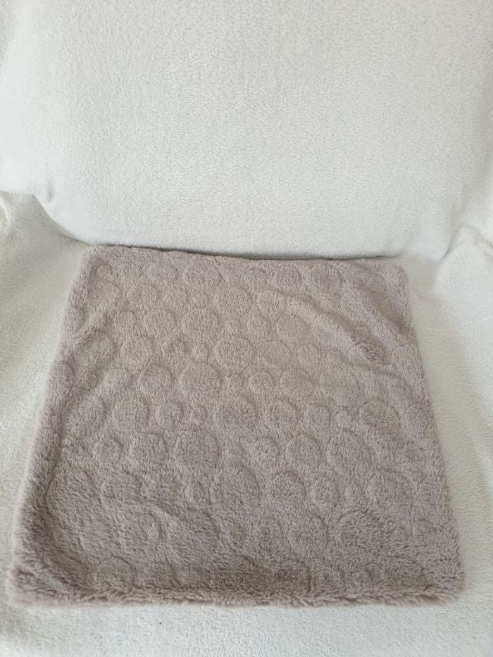 Housse de coussin. Tres douce. Avec fermeture éclair. Elle mesure environ 45x45cm Petits ronds en motif. Parfait état.