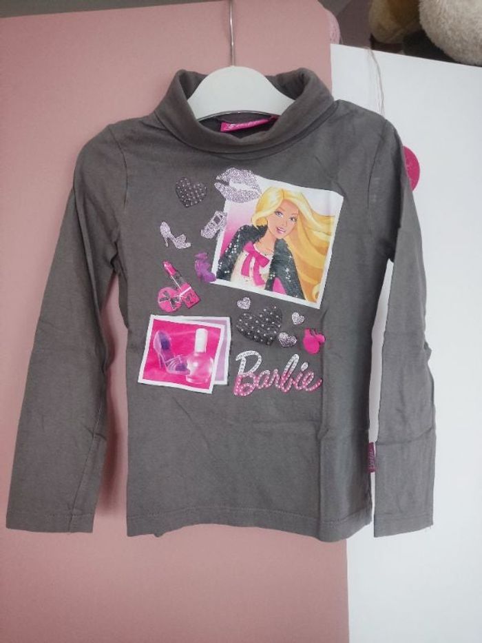 Sous pull col roulé barbie, taille 6 ans, très bon état (juste marque de pince a linge, voir photo) sinon pas de tâches ni trou.