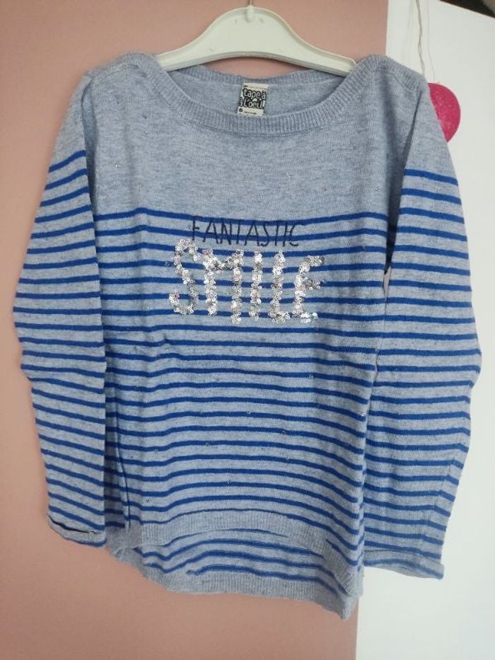 Pull printemps/été, inscription à sequins, marque Tape a l'oeil, taille 6 ans, très bon état sans défauts. Peu porté