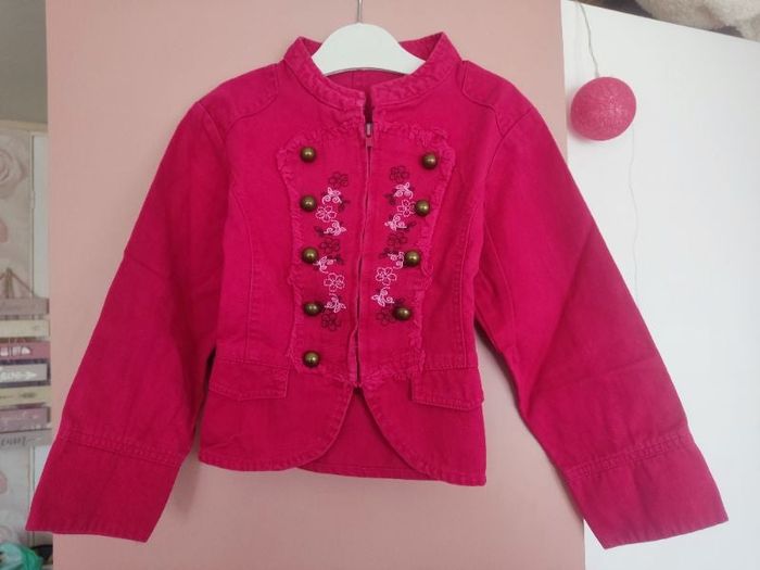 Veste en jean rouge bordeaux, avec effet usure et broderie, marque in extenso, taille 6 ans, en bon état (juste le bord du fermoir qui est un peu cassé, voir photo, sinon pas de tâches ni trou).