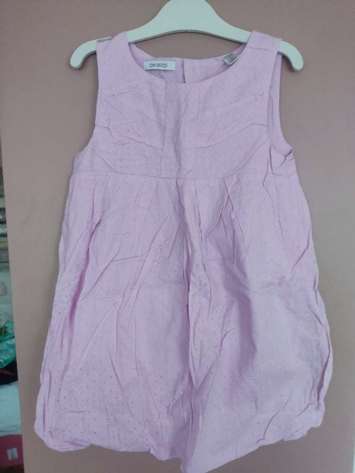 Robe rose clair, effet boule, marque Okaïdi, taille 6 ans. Très bon état (il manque juste un bouton dans le haut du dos mais vous pouvez toujours le remplacer pour les couturières, sinon sans tâches, ni trou).