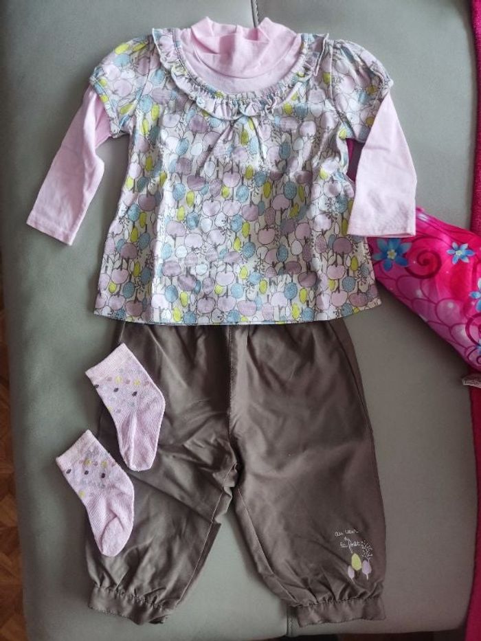 Ensemble 2 pièces, dont tee shirt manches longues à motifs + pantalon et chaussettes assortis. En très bon état sans défauts. Acheté chez boutique plus.