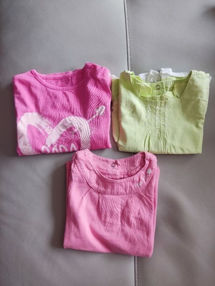 Lot 3 hauts manches courtes, dont tee shirt rose papa for ever marque kitchoun très bon état sans défauts, un vert anis avec quelques léger défaut voir photo, et un rose miss baby marque Tape à l'oeil très bon état sans défauts. 4,50€ le lot.