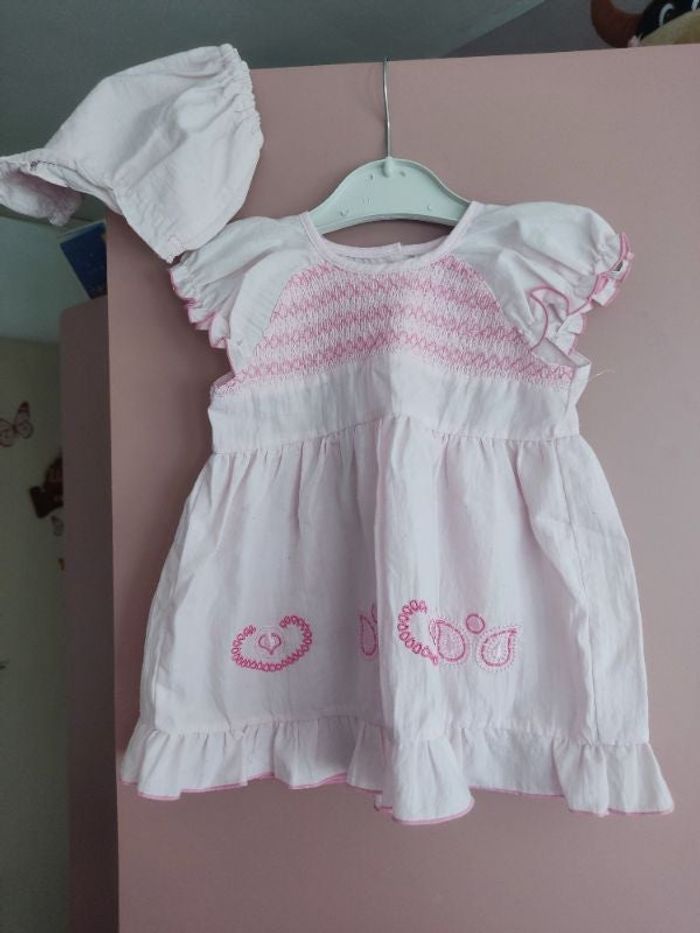 Robe légère + culotte assortie + bandeau assorti. En bon état (légères bouloches sinon pas de tâches ni trou). Taille 12-18 mois.