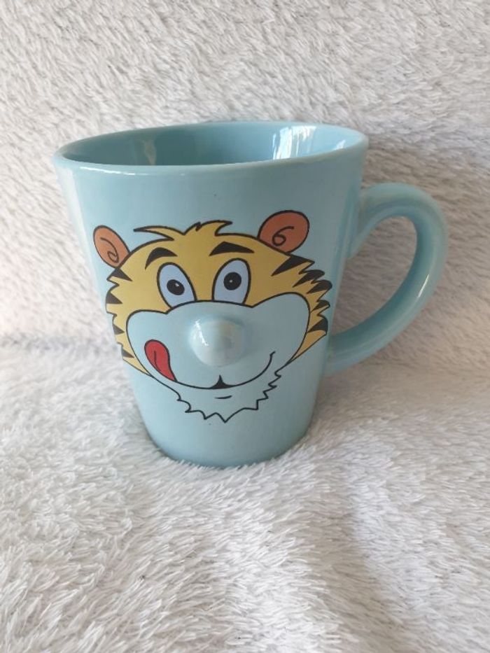 Mug ou tasse couleur bleu. Avec anse. Décor tete de tigre.